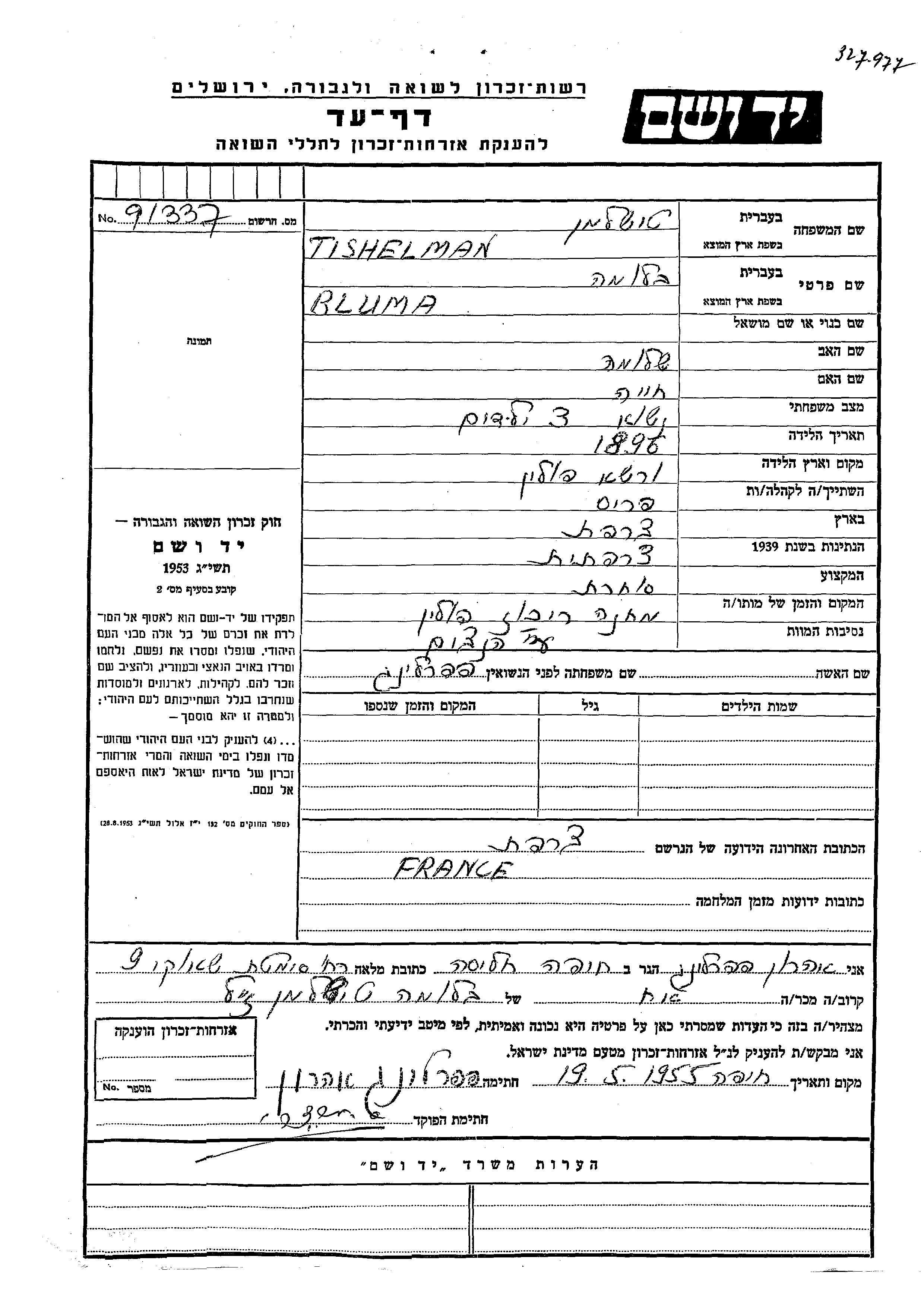 Bluma Tishelman, geb. Feferling wurde im Jahr 1896 in Warszawa, Polen geboren. Sie war die Tochter von Shlomo und Khaia. Sie war Kaufmann/-frau und Verheiratet. Vor dem Zweiten Weltkrieg lebte sie in Frankreich.