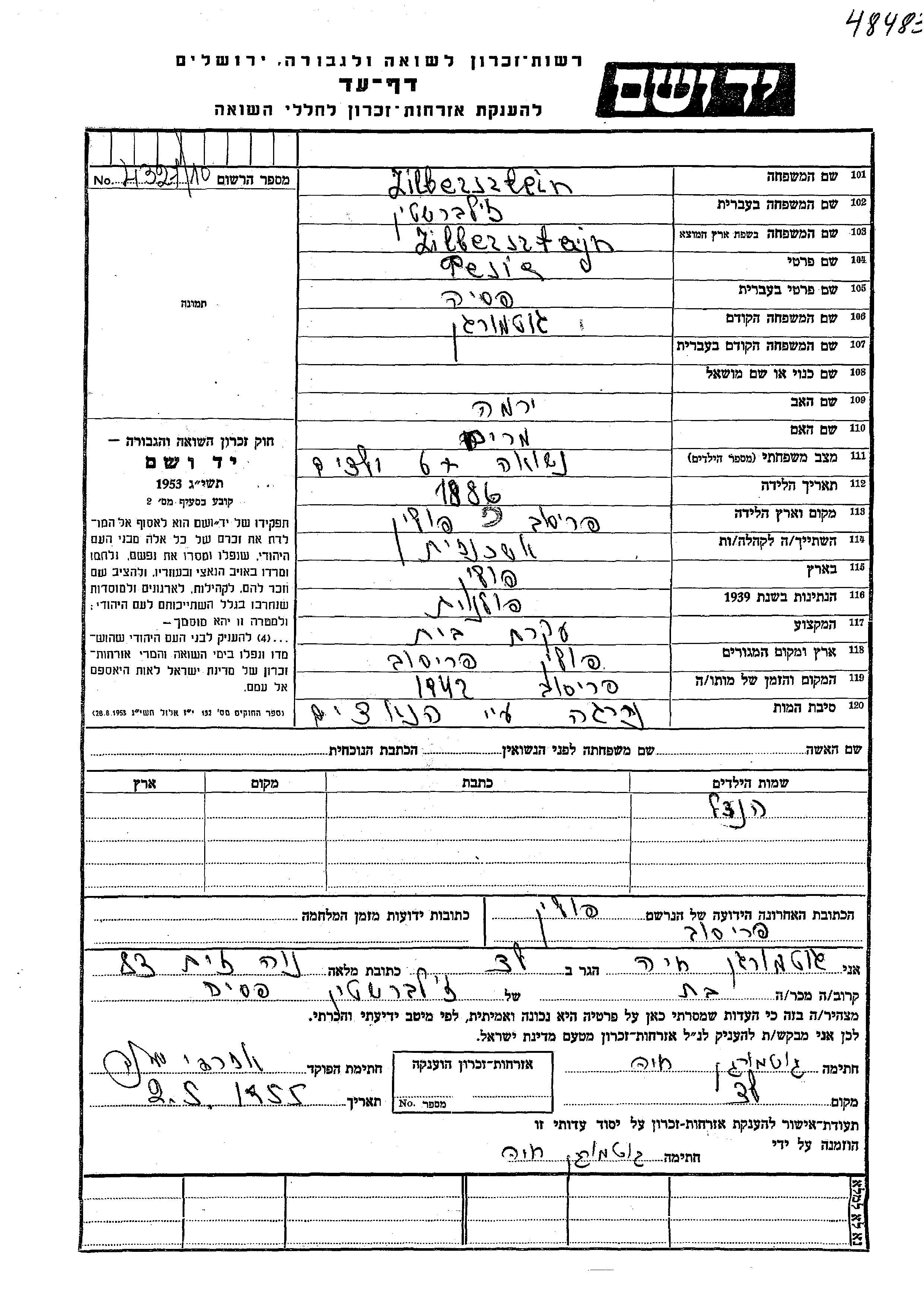 Pesia Zilbersztein, geb. Gutmorgen wurde im Jahr 1886 in Parysow, Polen geboren. Sie war die Tochter von Irma und Miriam. Sie war Hausfrau und Verheiratet. Während des Krieges war sie in Parysow, Polen.