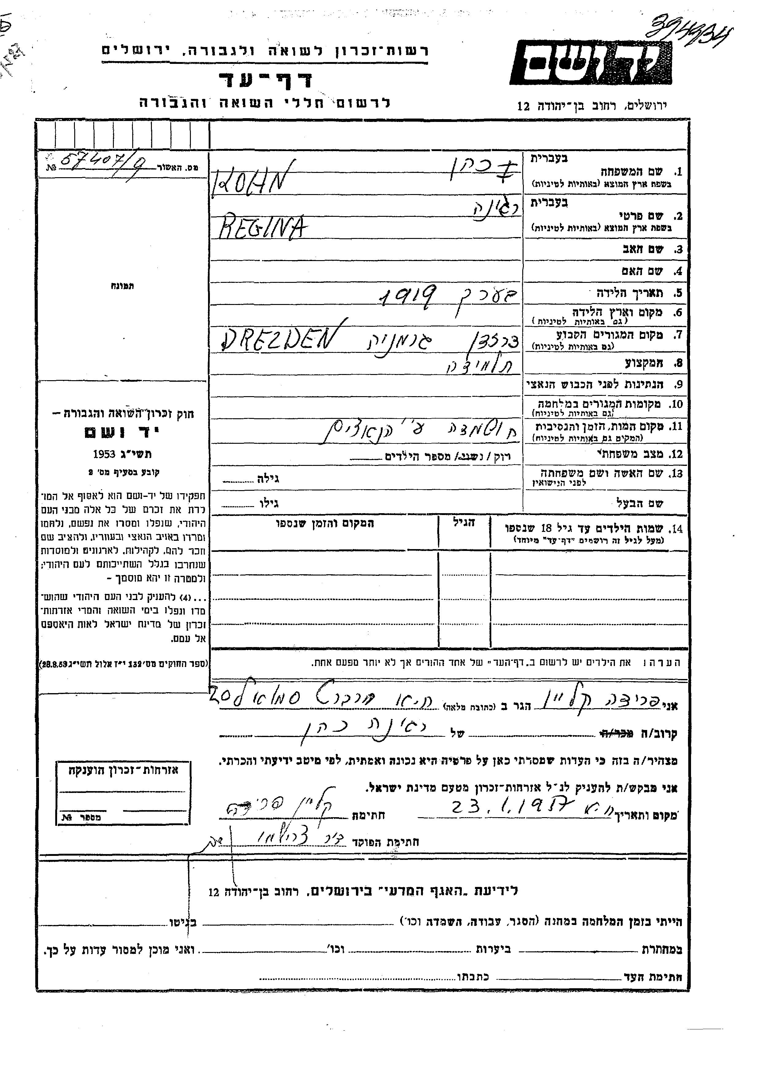 Regina Kohn wurde im Jahr 1919 geboren. Sie war Schüler/-in und Ledig. Vor dem Zweiten Weltkrieg lebte sie in Drezden, Deutsches Reich.