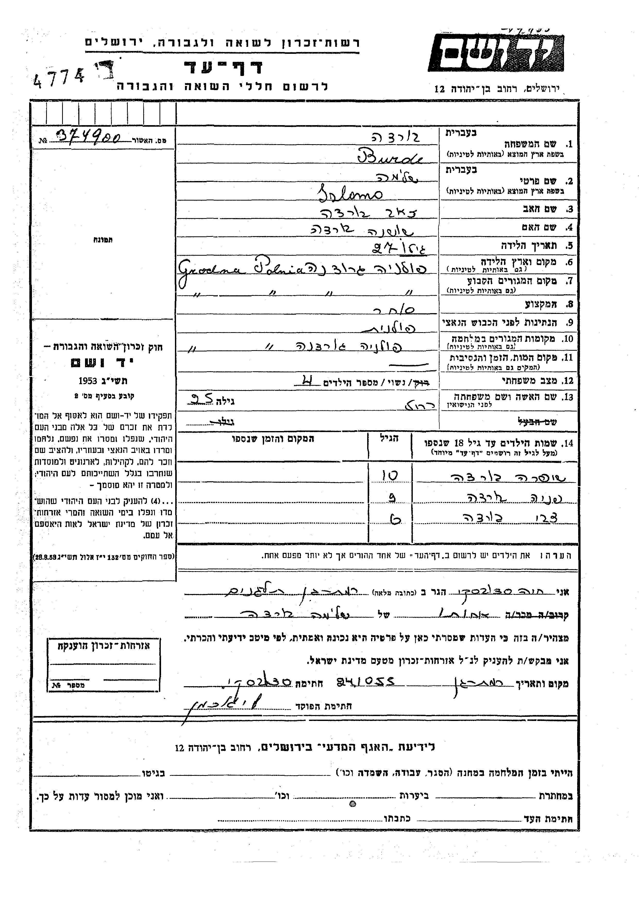 Szlomo Burde wurde in Grodno, Polen geboren. Er war der Sohn von Zeev und Shoshana. Er war Kaufmann/-frau und mit Rakhel Verheiratet. Während des Krieges war er in Grodno, Polen.