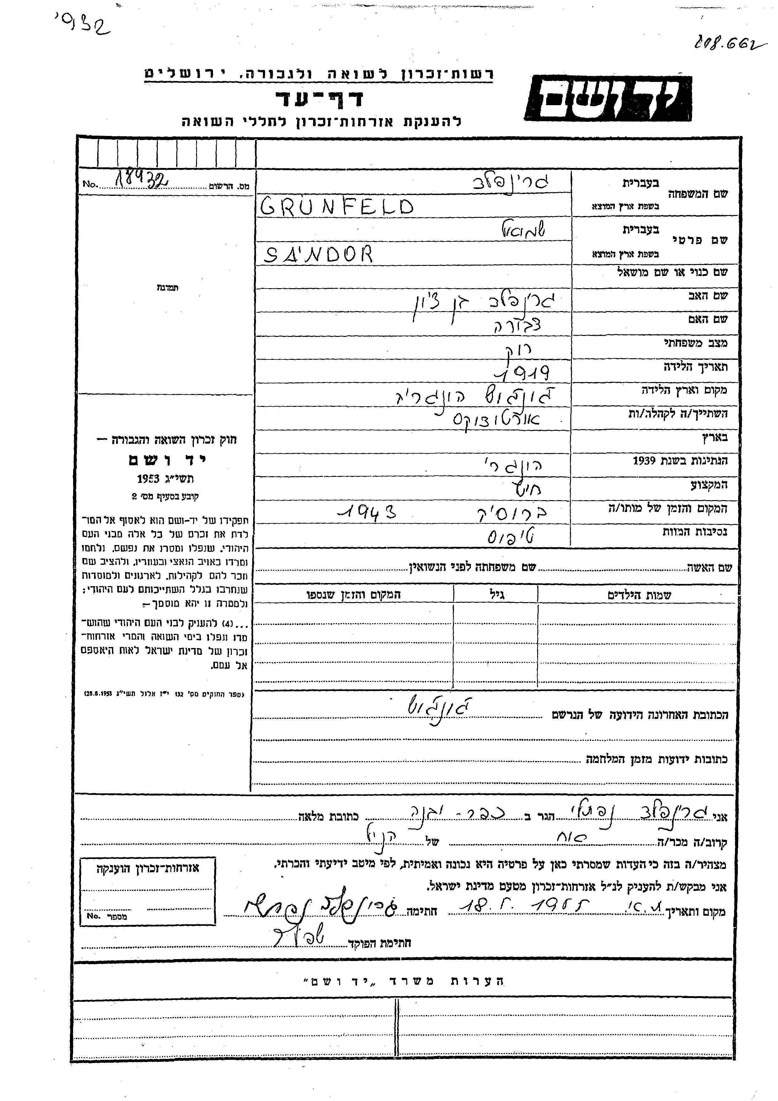 Sandor Shmuel Grunfeld wurde im Jahr 1919 in Gyongyos, Ungarn geboren. Er war der Sohn von Bentzion und Dvora. Er war Schneider. Während des Krieges war er in Gyongyos, Ungarn.