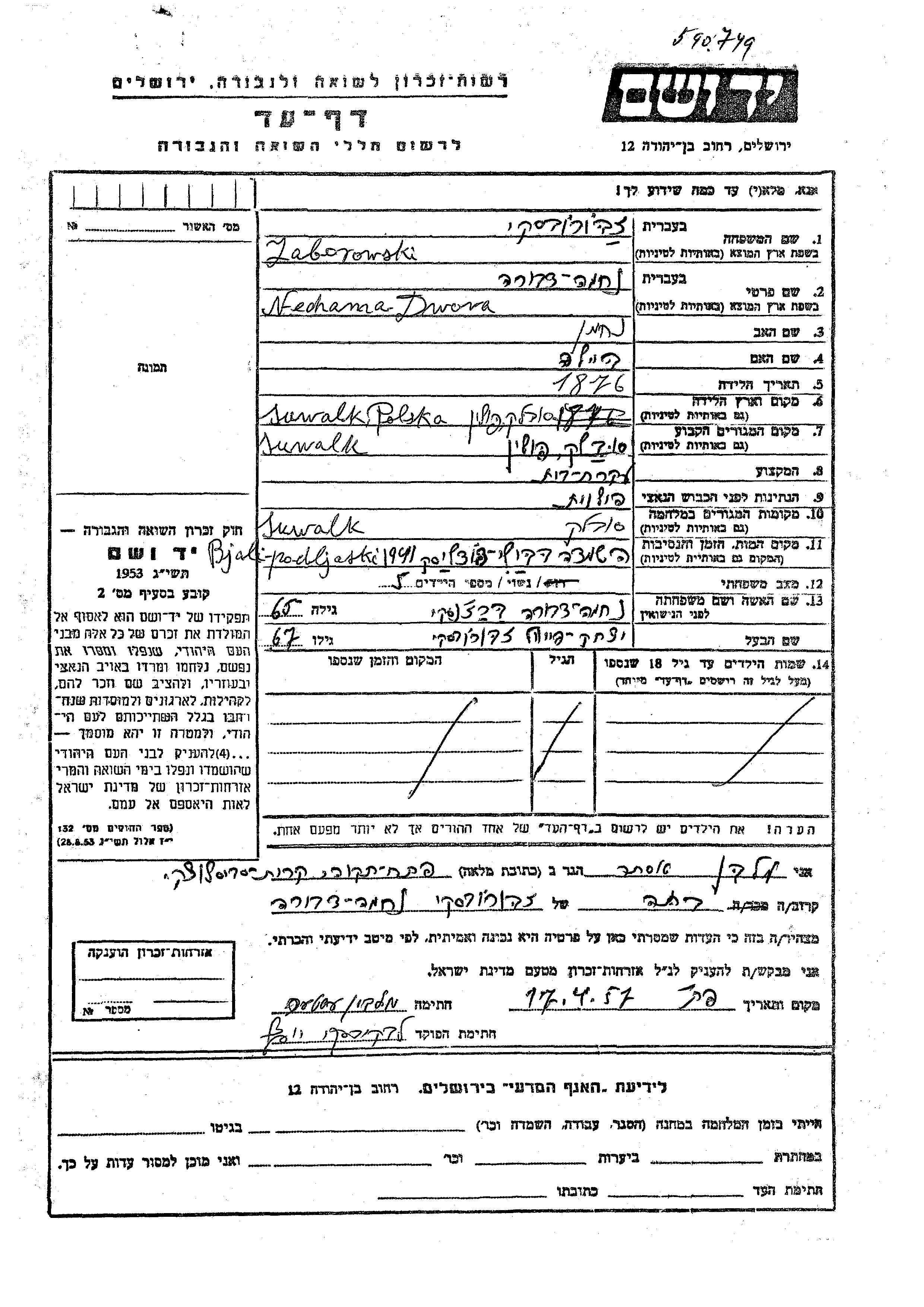 Nehama Dwora Zaborowski Zborovski, geb. Berezanski wurde im Jahr 1876 in Suwalki, Polen geboren. Sie war die Tochter von Nakhman und Beila. Sie war Hausfrau und mit Yitzkhak Faivel Verheiratet. Vor dem Zweiten Weltkrieg lebte sie in Suwalki, Polen. Während des Krieges war sie in Suwalki, Polen.