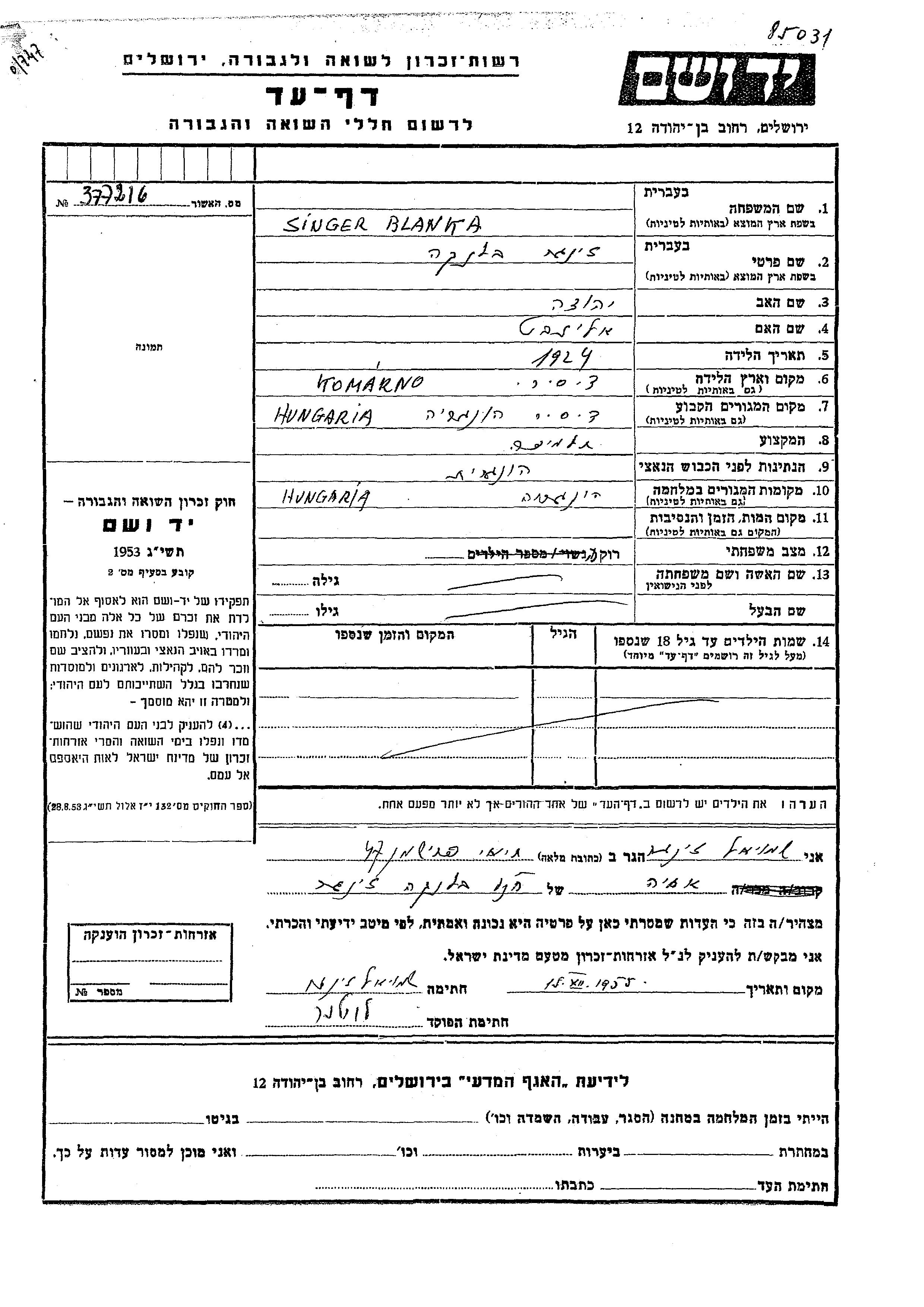 Blanka Singer wurde im Jahr 1924 in Komarno, Tschechoslowakei geboren. Sie war die Tochter von Yehuda und Elizabet. Sie war Schüler/-in und Ledig. Vor dem Zweiten Weltkrieg lebte sie in Ungarn. Während des Krieges war sie in Ungarn.