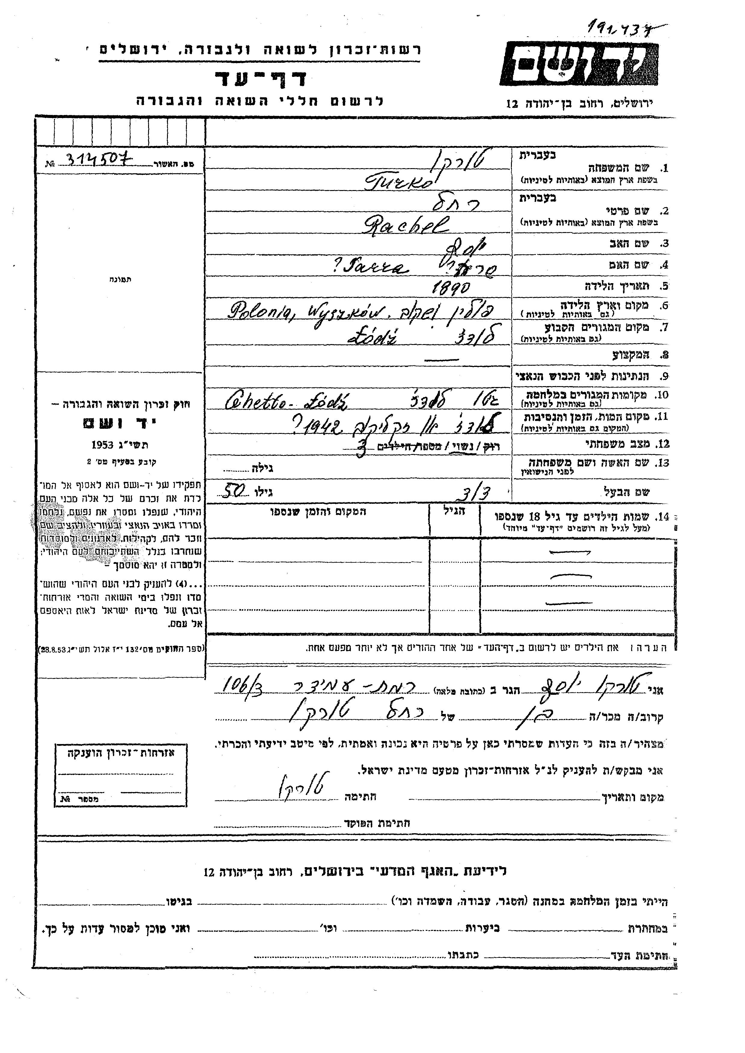Rachel Turko wurde im Jahr 1890 in Wyszkow, Polen geboren. Sie war die Tochter von Yosef und Sara. Sie war mit David Verheiratet. Vor dem Zweiten Weltkrieg lebte sie in Lodz, Polen. Während des Krieges war sie in Lodz, Polen.