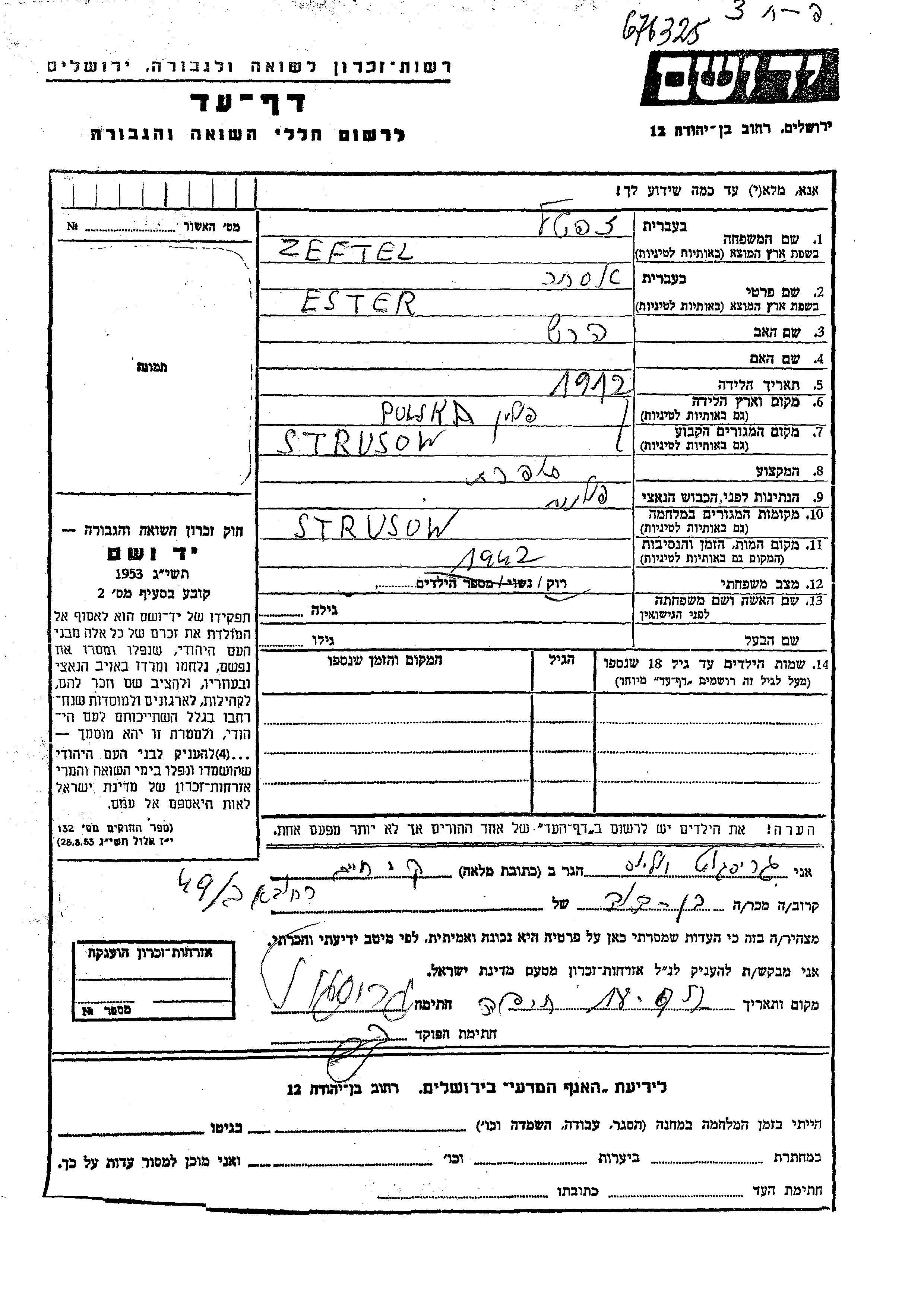 Ester Zeftel wurde im Jahr 1912 in Polen geboren. Sie war die Tochter von Hersh. Sie war Schneiderin und Ledig. Vor dem Zweiten Weltkrieg lebte sie in Strusow, Polen. Während des Krieges war sie in Strusow, Polen.