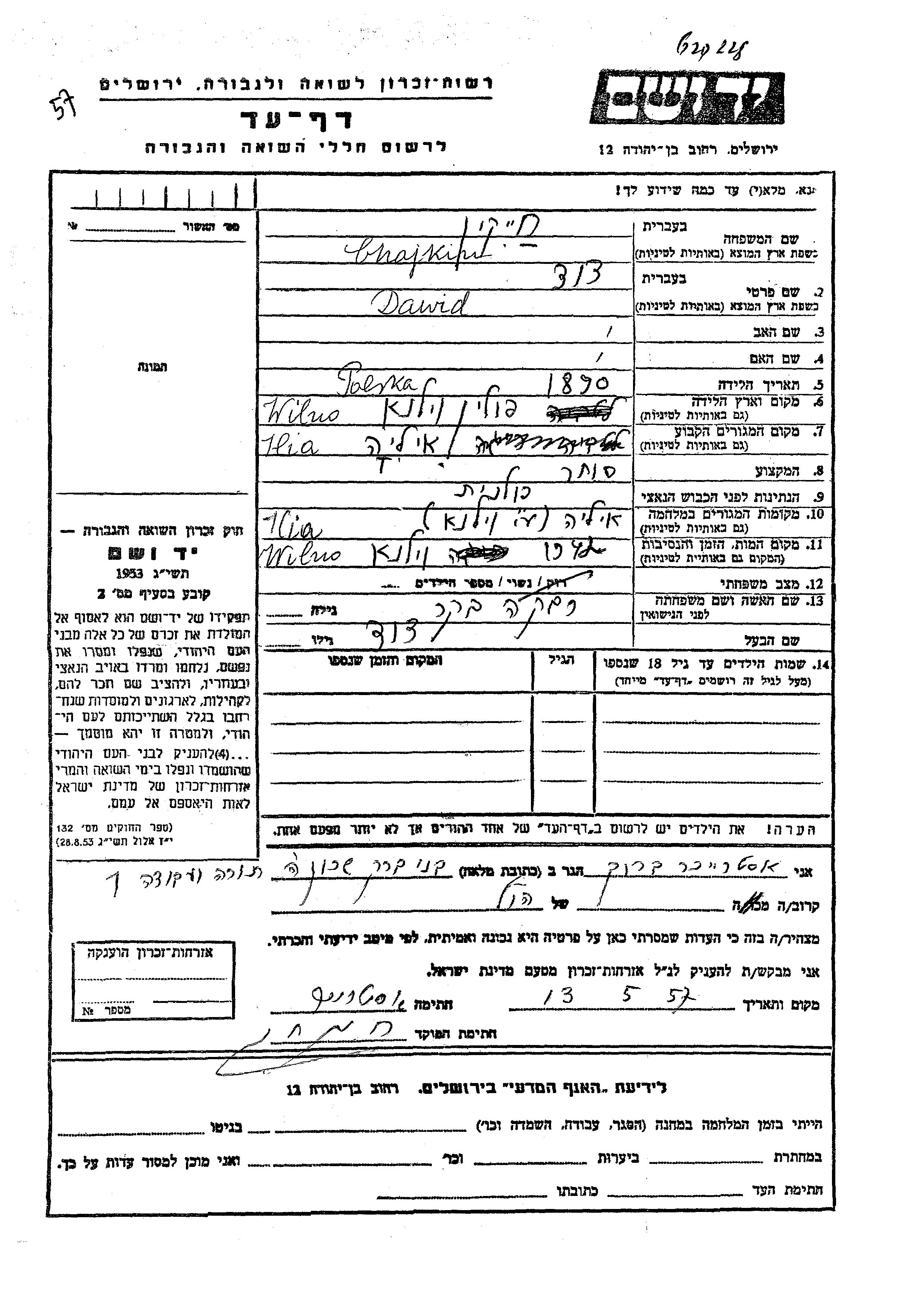 David wurde in der Schoah ermordet. Todesort: Wilno, Polen im Jahr 1942.