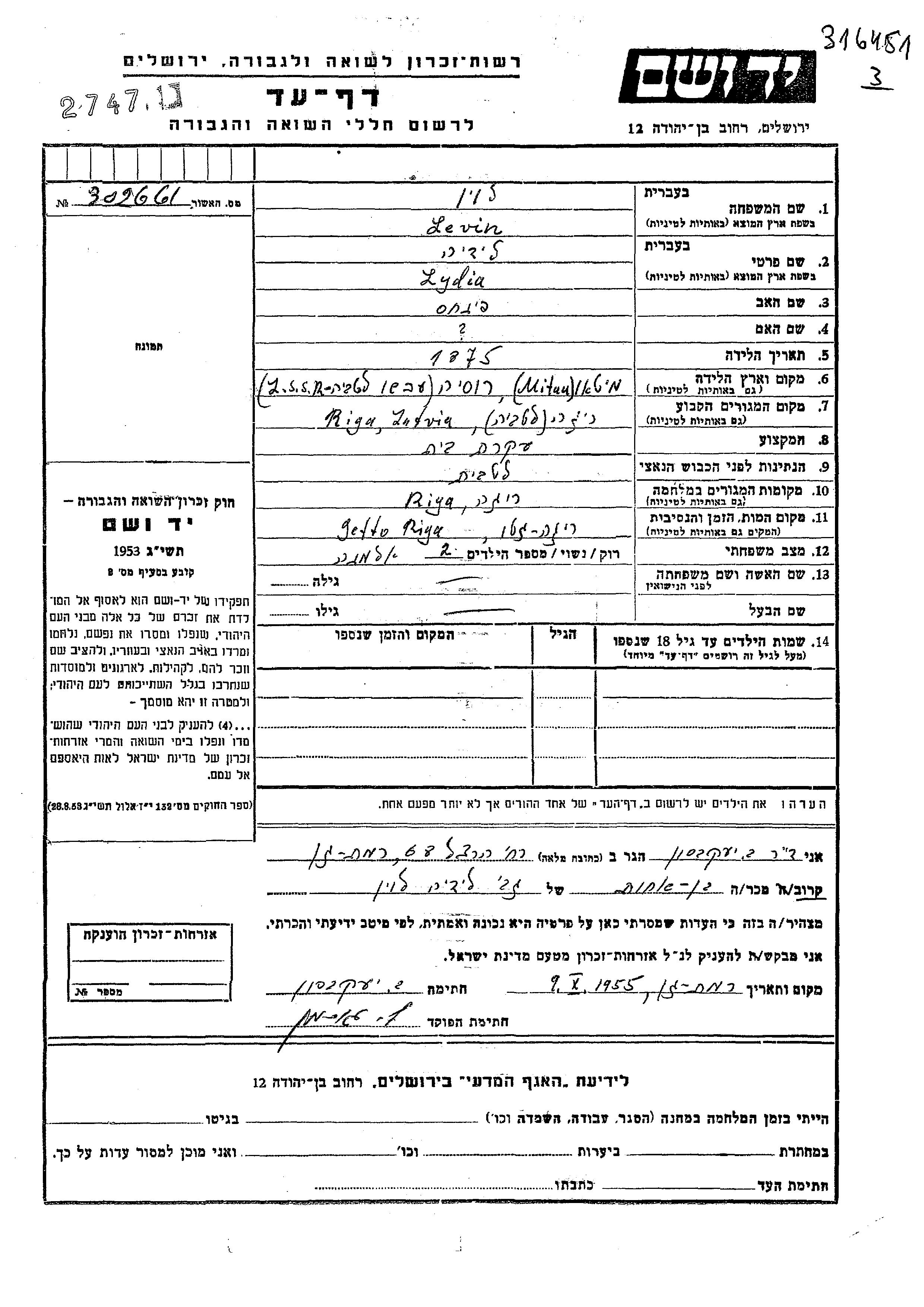 Lydia Levin wurde im Jahr 1875 in Mitau, Lettland geboren. Sie war die Tochter von Pinkhas. Sie war Hausfrau und Witwe. Vor dem Zweiten Weltkrieg lebte sie in Riga, Lettland. Während des Krieges war sie in Riga, Lettland.