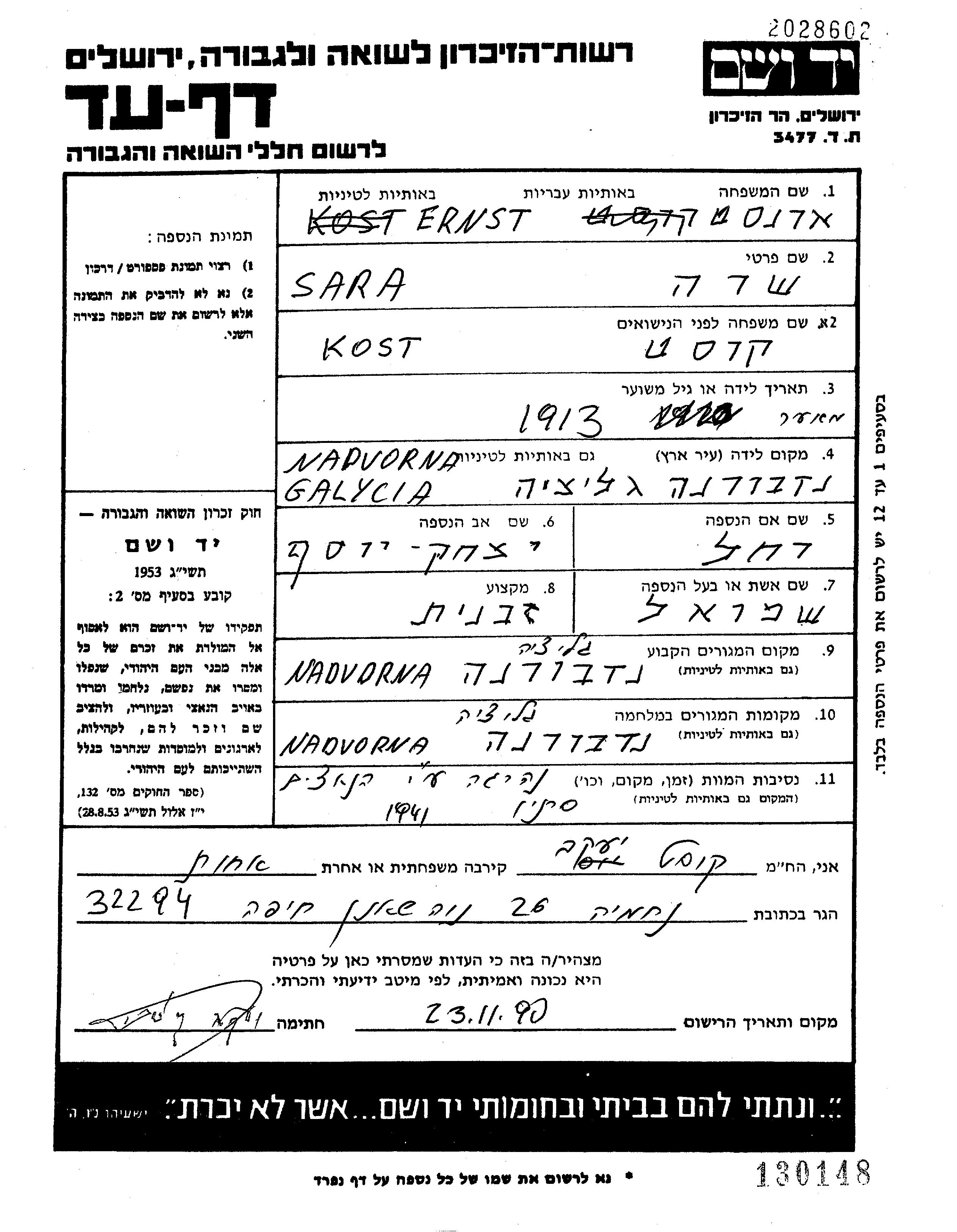Sara Ernst, geb. Kost wurde im Jahr 1911 in Nadworna, Polen geboren. Sie war mit Shmuel Verheiratet. Während des Krieges war sie in Nadworna, Polen.