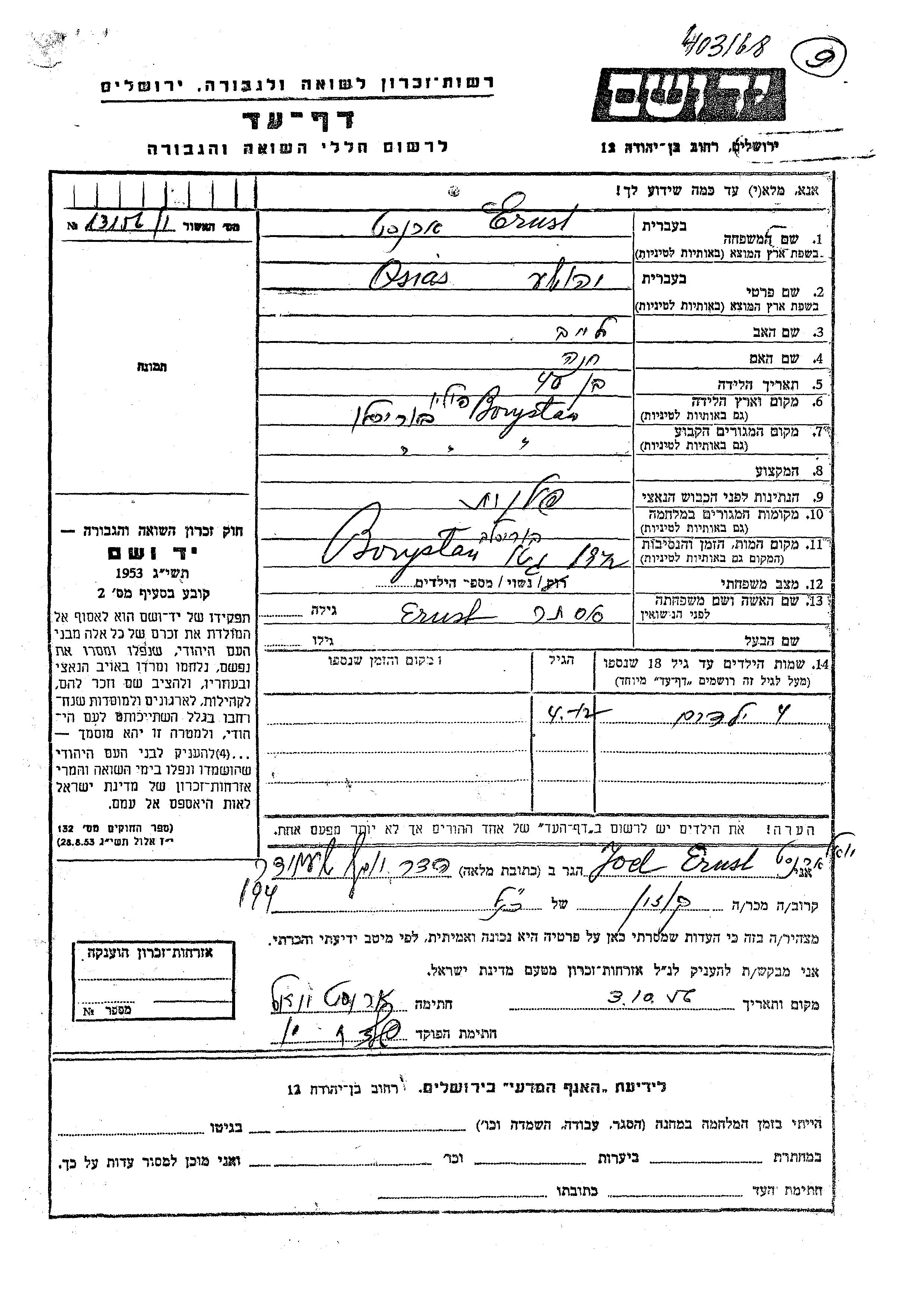 Osia Yehoshua Ernst wurde in Boryslaw, Polen geboren. Er war der Sohn von Leib und Khana. Er war mit Ester Verheiratet. Vor dem Zweiten Weltkrieg lebte er in Boryslaw, Polen. Während des Krieges war er in Boryslaw, Polen.