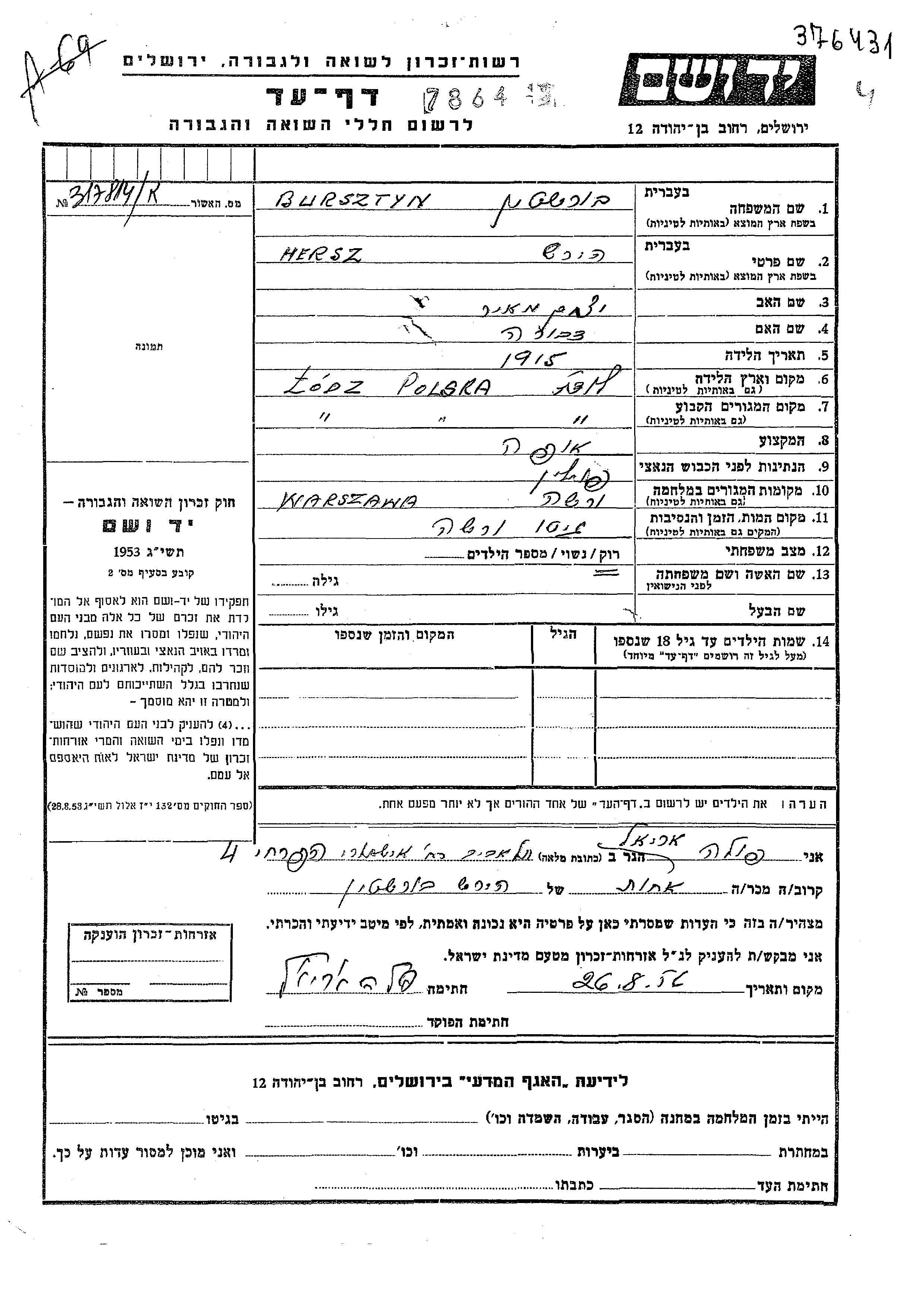 Hersz Bursztyn wurde im Jahr 1915 in Lodz, Polen geboren. Er war der Sohn von Yitzkhak Meir und Dvora. Er war Bäcker/-in. Vor dem Zweiten Weltkrieg lebte er in Lodz, Polen. Während des Krieges war er in Warszawa, Polen.