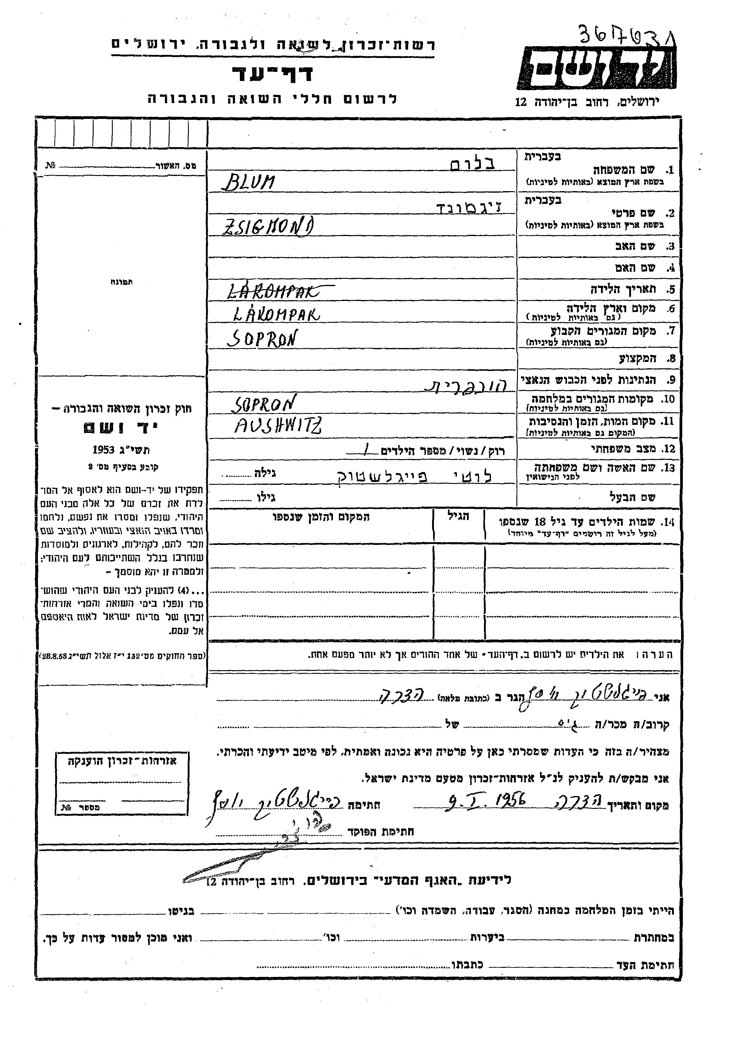 Zsigmond Blum wurde in Lakompak, Österreich geboren. Er war mit Loti, geb. Feigelshtok Verheiratet. Vor dem Zweiten Weltkrieg lebte er in Sopron, Ungarn. Während des Krieges war er in Sopron, Ungarn.