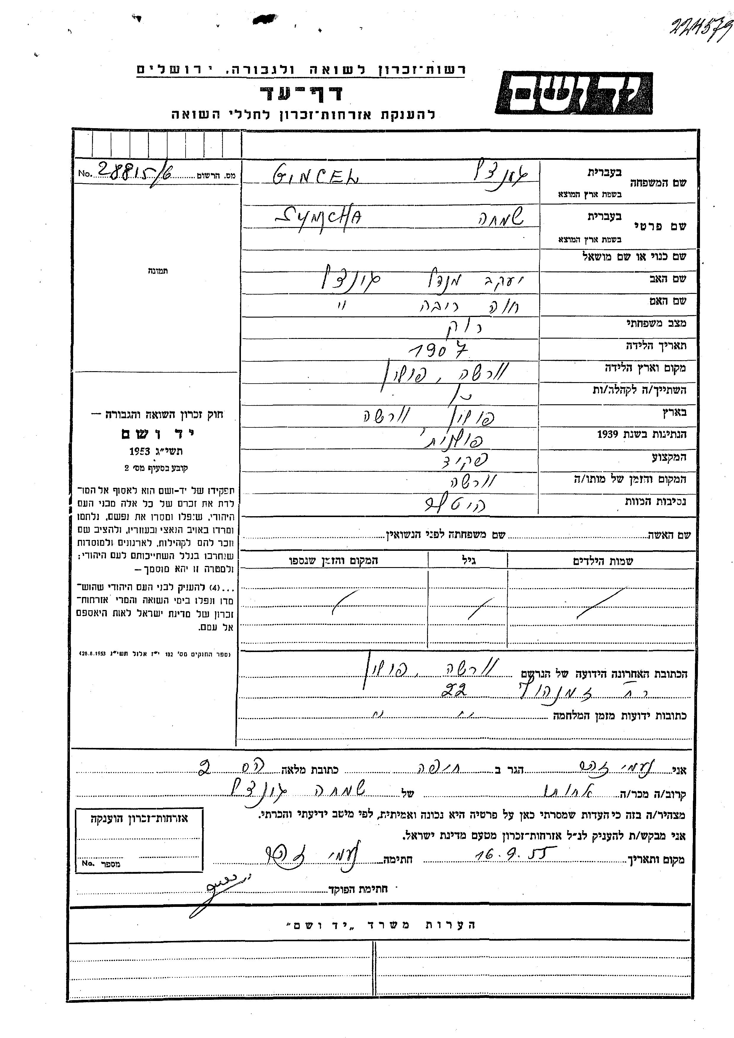 Symcha Gincel wurde im Jahr 1907 in Warsaw, Polen geboren. Er war der Sohn von Yaakov Mendel und Khava Riva. Er war Angestellte/-r und Ledig. Vor dem Zweiten Weltkrieg lebte er in Warsaw, Polen. Während des Krieges war er in Warsaw, Polen.