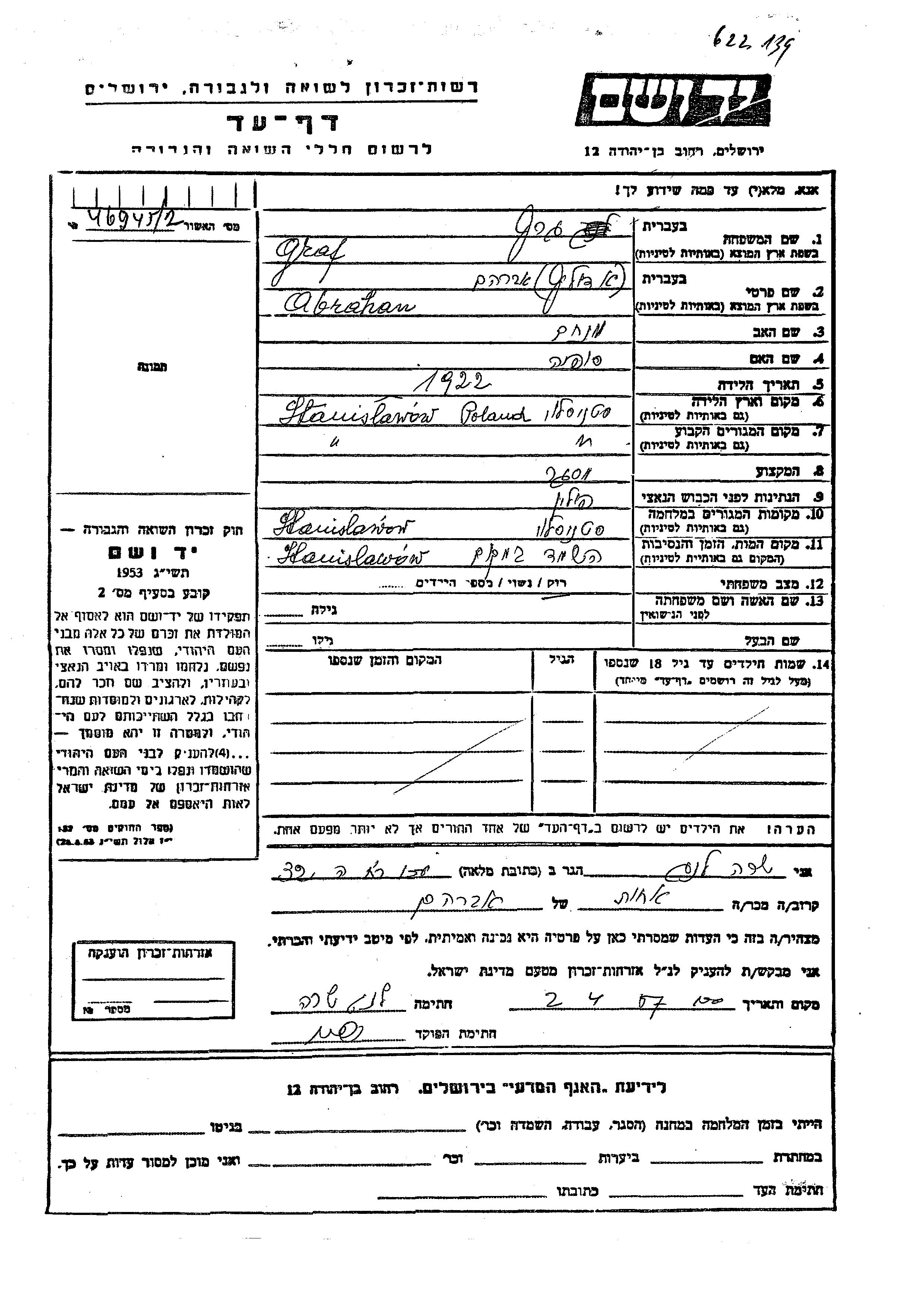 Abraham Adolf Graf wurde im Jahr 1922 in Stanislawow, Polen geboren. Er war der Sohn von Menakhem und Sofia. Er war Schlosser und Ledig. Vor dem Zweiten Weltkrieg lebte er in Stanislawow, Polen. Während des Krieges war er in Stanislawow, Polen.