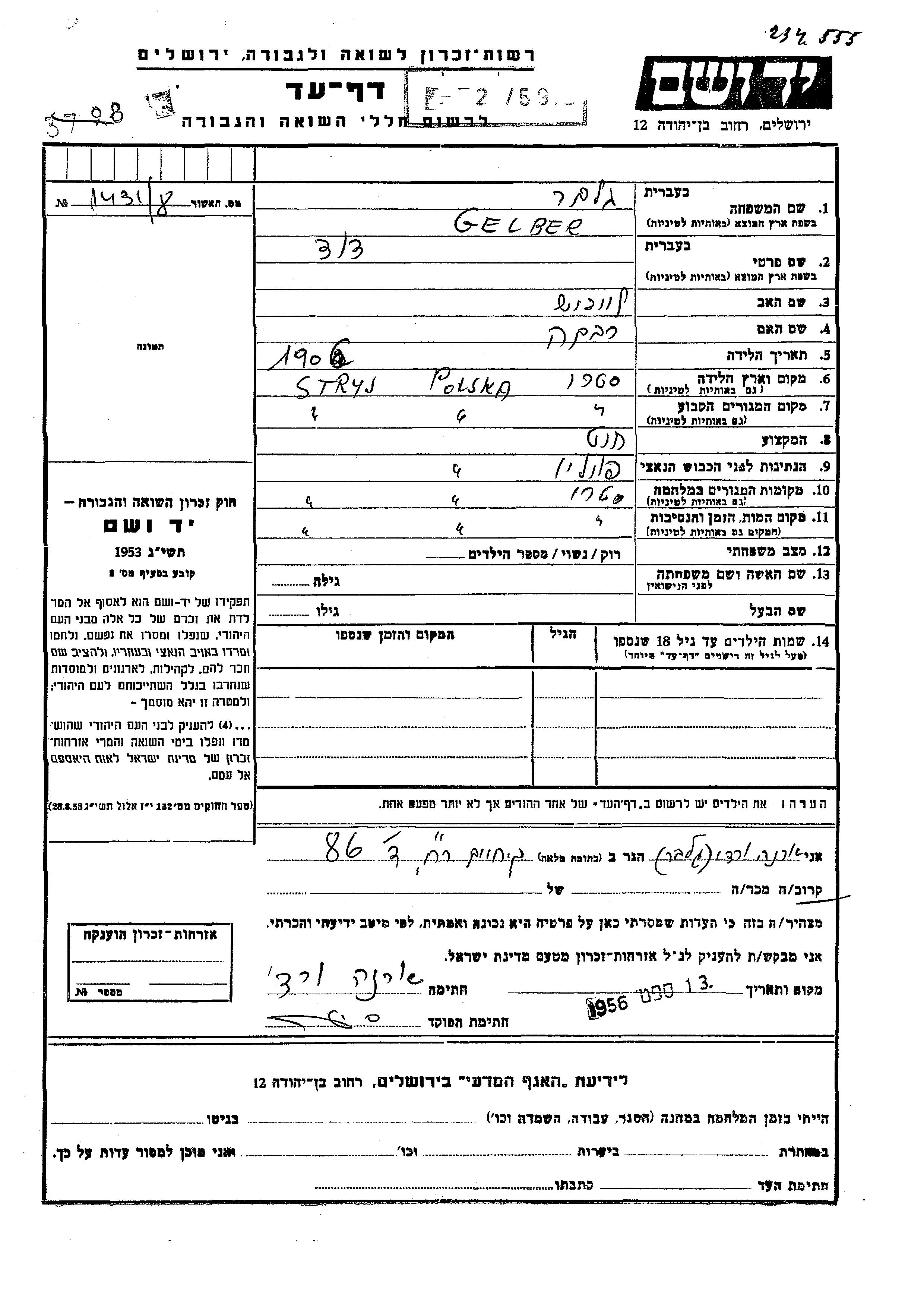 David Gelber wurde im Jahr 1906 in Stry, Polen geboren. Er war der Sohn von Leibish und Rivka. Er war Schneider. Vor dem Zweiten Weltkrieg lebte er in Stryj, Polen. Während des Krieges war er in Stry, Polen.