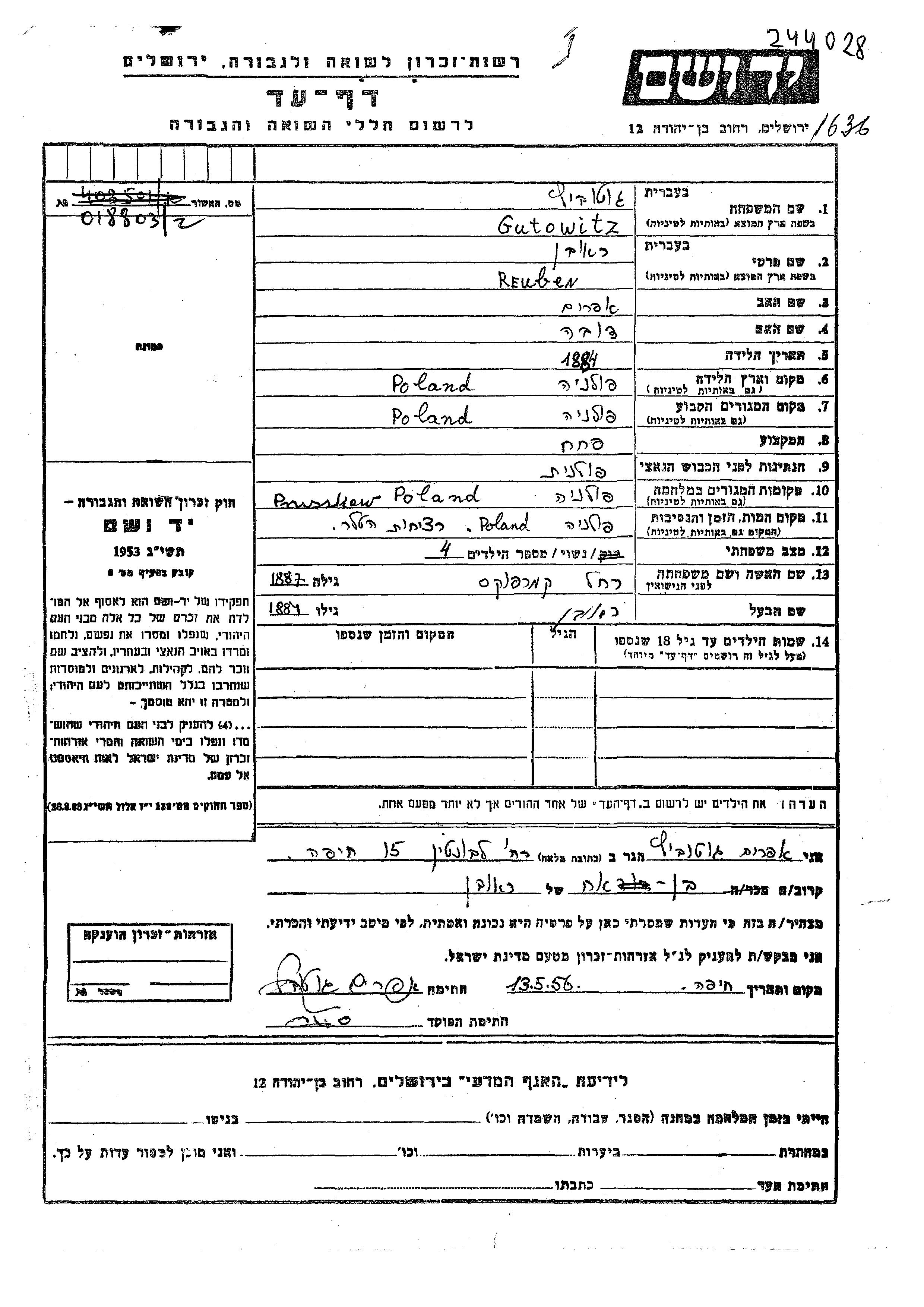 Reuven Gutowitz wurde im Jahr 1884 in Polen geboren. Er war der Sohn von Efraim und Doba. Er war Blechschmied und mit Rakhel, geb. Kamerfuks Verheiratet. Vor dem Zweiten Weltkrieg lebte er in Polen. Während des Krieges war er in Pruszkow, Polen.