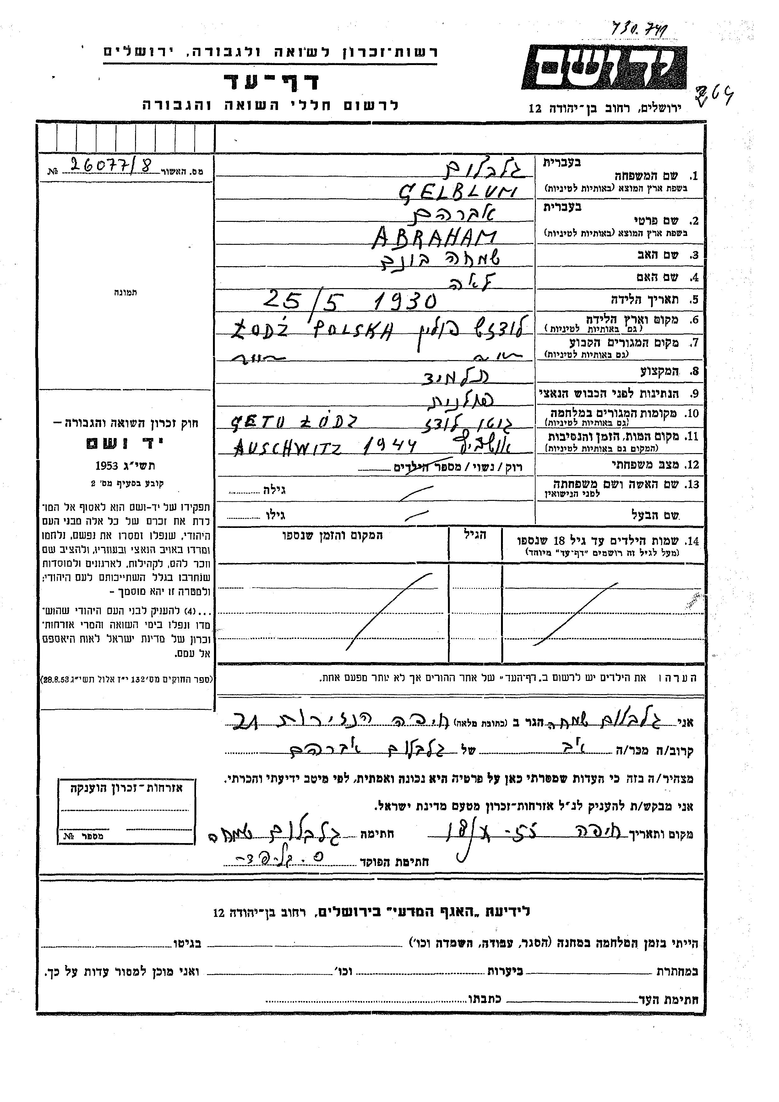 Gelblum Abraham 1930 Lodz, Polen Gedenkblatt