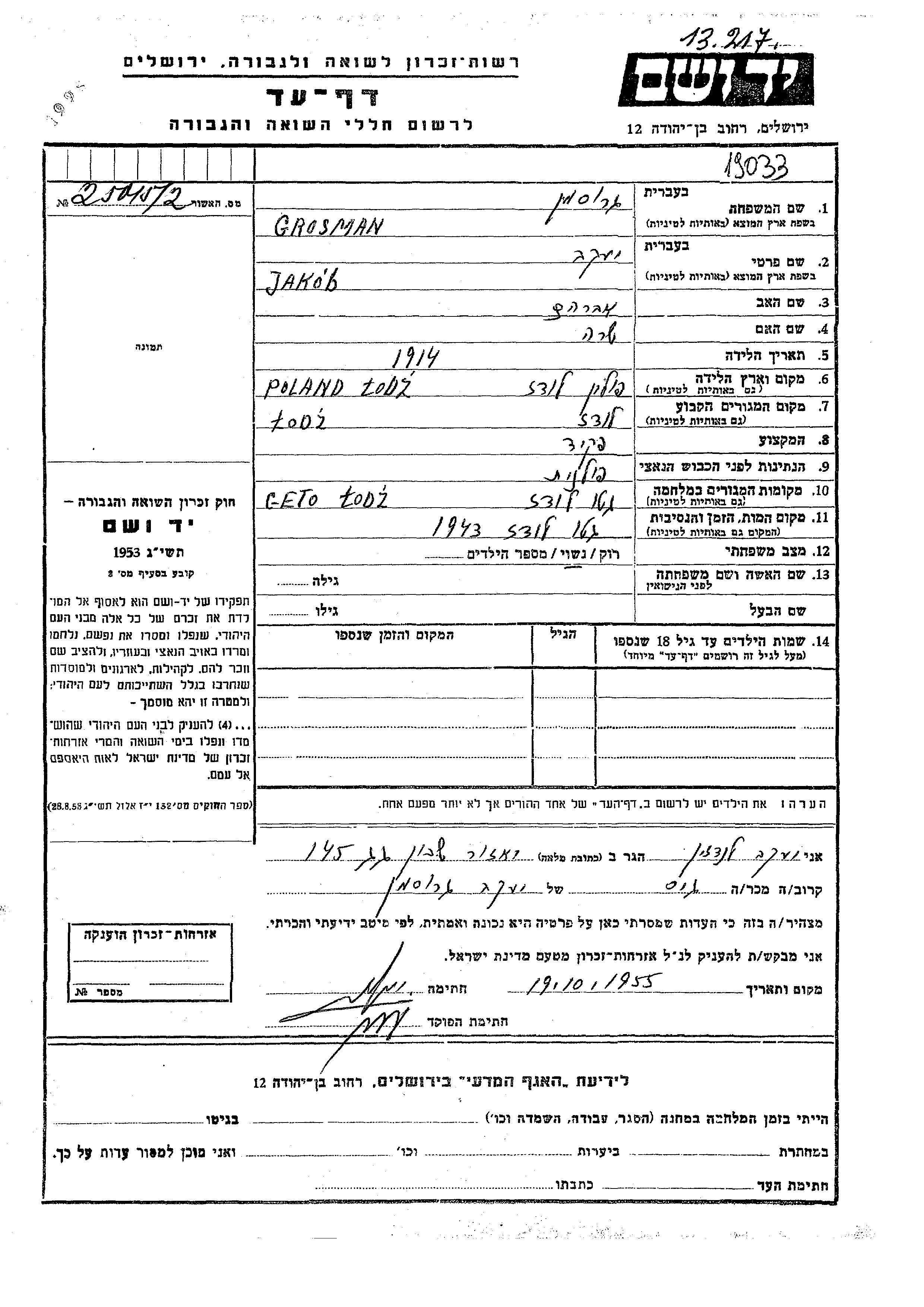 Jakob Grosman wurde im Jahr 1914 in Lodz, Polen geboren. Er war der Sohn von Avraham und Sara. Er war Angestellte/-r und Verheiratet. Vor dem Zweiten Weltkrieg lebte er in Lodz, Polen. Während des Krieges war er in Lodz, Polen.