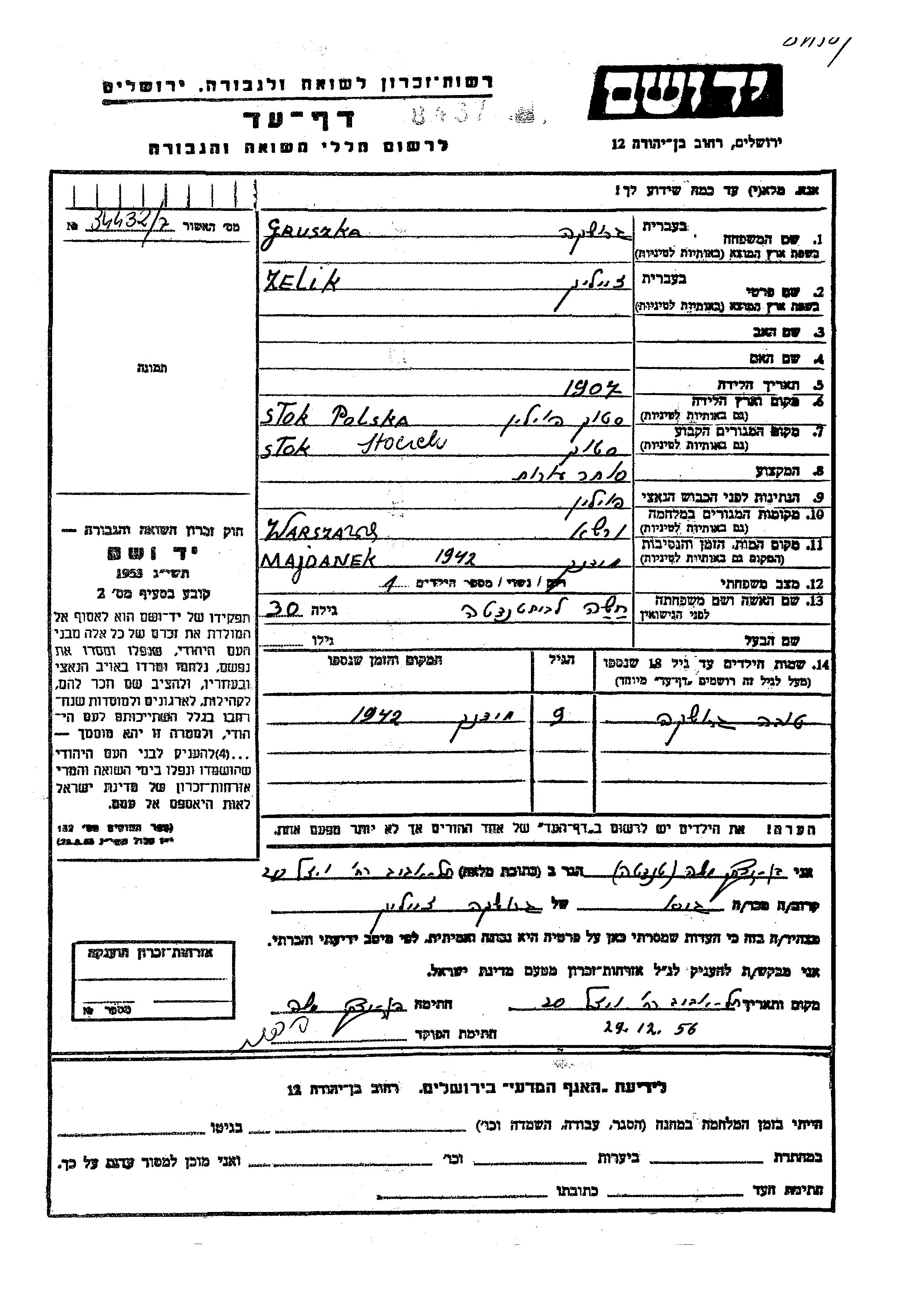 Zelig Gruszka wurde im Jahr 1907 in Stok, Polen geboren. Er war Kaufmann/-frau und mit Khasha, geb. Tandeta Verheiratet. Vor dem Zweiten Weltkrieg lebte er in Stok, Polen. Während des Krieges war er in Warszawa, Polen.