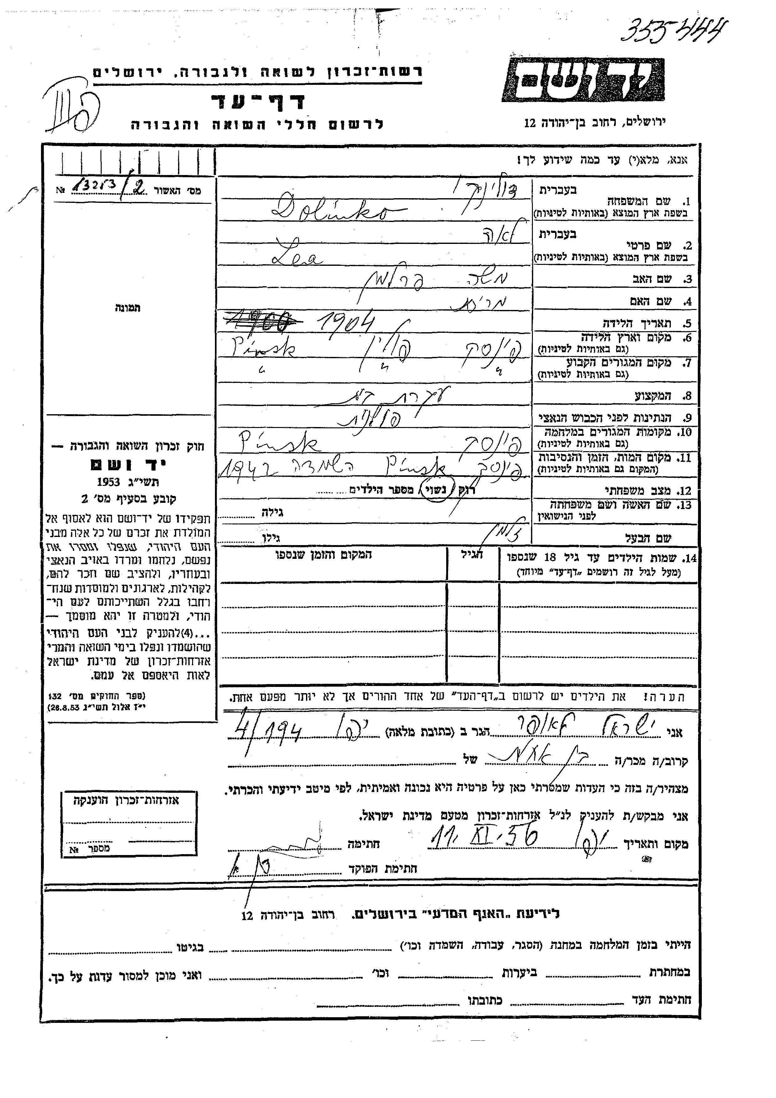 Lea Dolinko wurde im Jahr 1904 in Pinsk, Polen geboren. Sie war die Tochter von Moshe und Miriam. Sie war Hausfrau und mit Zalman Verheiratet. Vor dem Zweiten Weltkrieg lebte sie in Pinsk, Polen. Während des Krieges war sie in Pinsk, Polen.