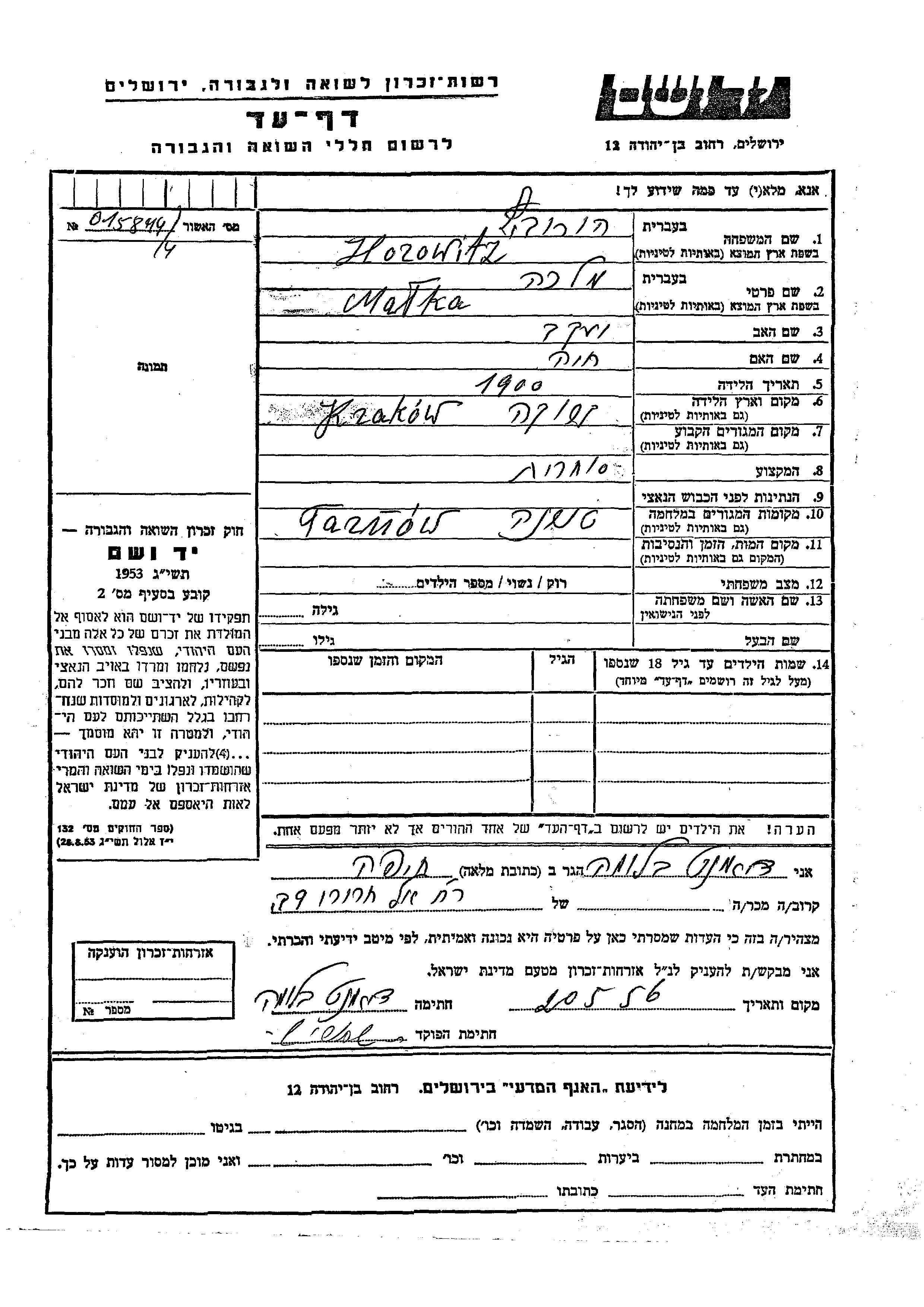 Malka Horowitz wurde im Jahr 1900 in Krakow, Polen geboren. Sie war die Tochter von Yaakov und Khaia. Sie war Kaufmann/-frau. Während des Krieges war sie in Tarna, Rumänien.