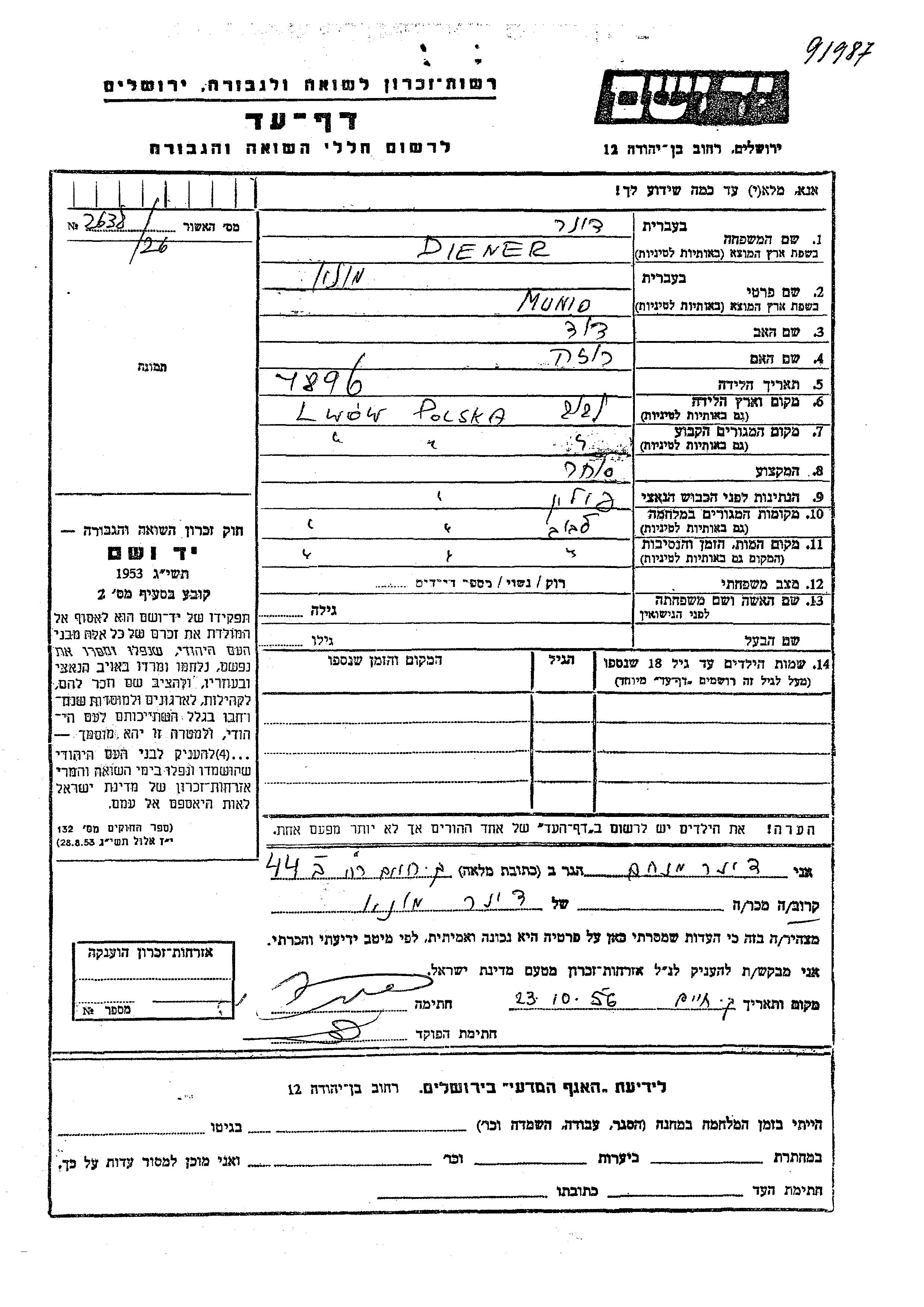 Munio Diener wurde im Jahr 1896 in Lwow, Polen geboren. Er war der Sohn von David und Roza. Er war Kaufmann/-frau. Vor dem Zweiten Weltkrieg lebte er in Lwow, Polen. Während des Krieges war er in Lwow, Polen.