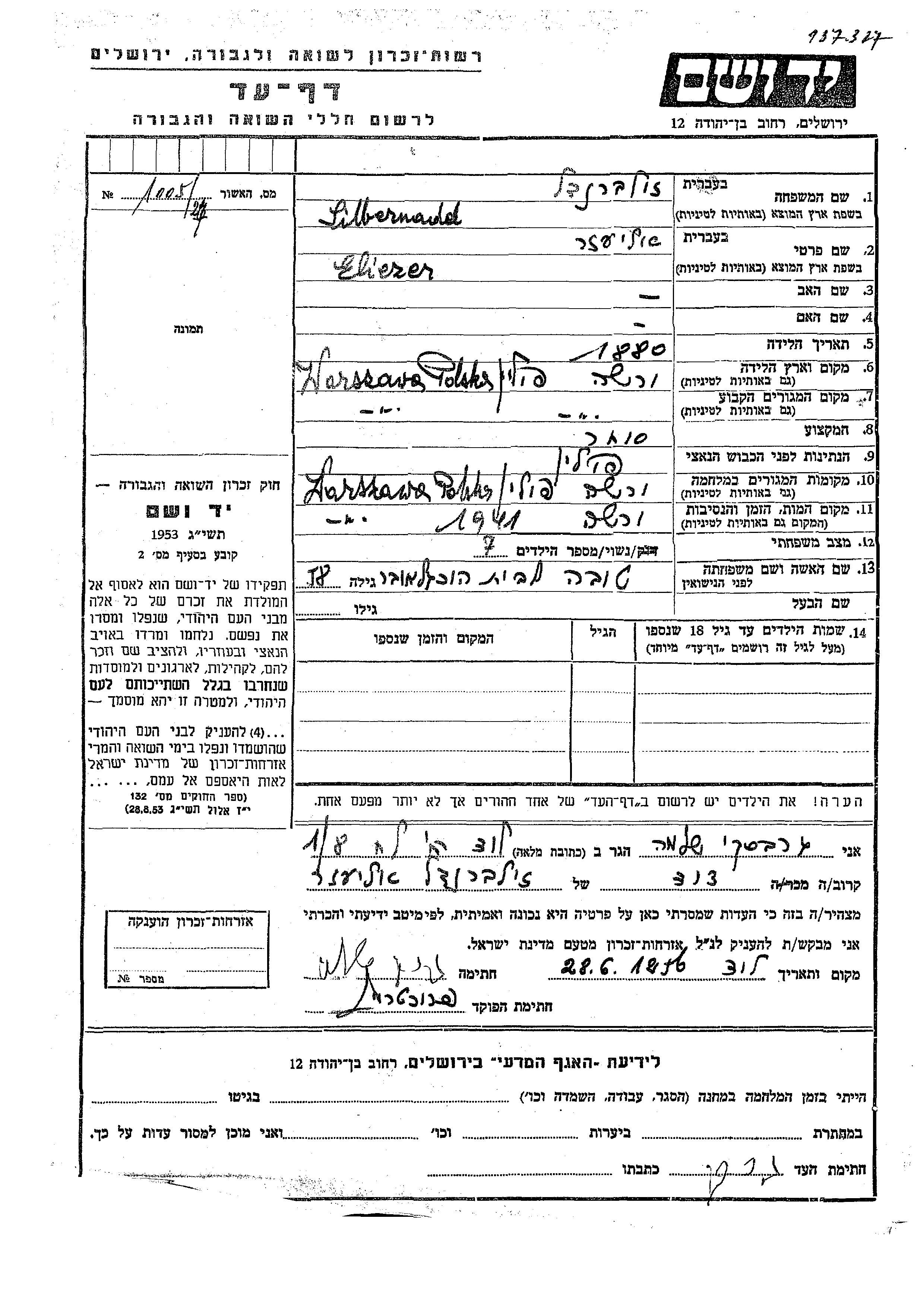 Eliezer wurde in der Schoah ermordet. Todesort: Warszawa, Polen im Jahr 1941.