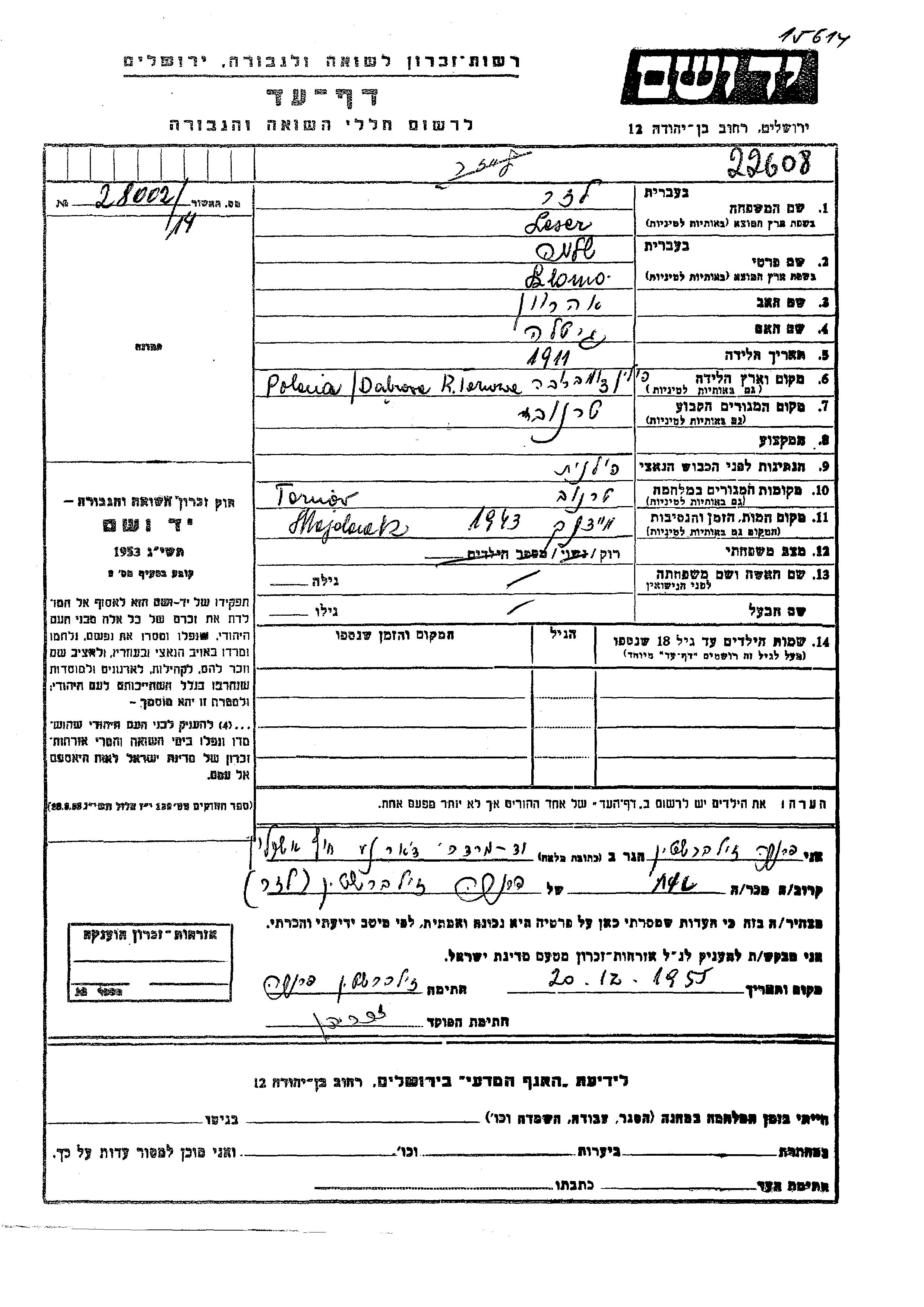 Leser Lazar Szlomo 1911 Dąbrowa, Polen Gedenkblatt