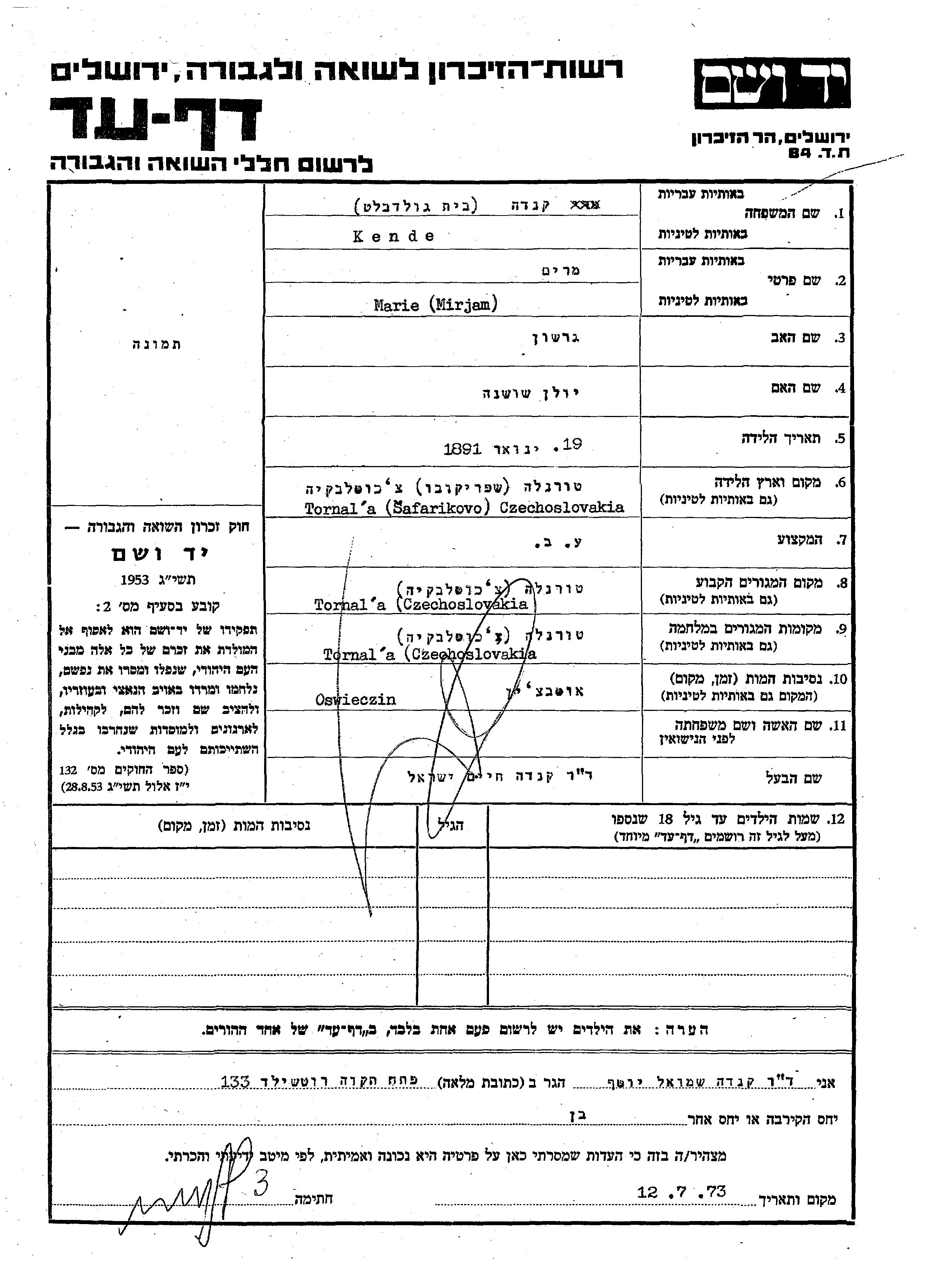Marie Mirjam Kende, geb. Goldblat wurde im Jahr 1891 in Safarikovo, Tschechoslowakei geboren. Sie war die Tochter von Gershon und Yolan Shoshana. Sie war Hausfrau. Vor dem Zweiten Weltkrieg lebte sie in Tornala, Tschechoslowakei. Während des Krieges war sie in Tornala, Tschechoslowakei.