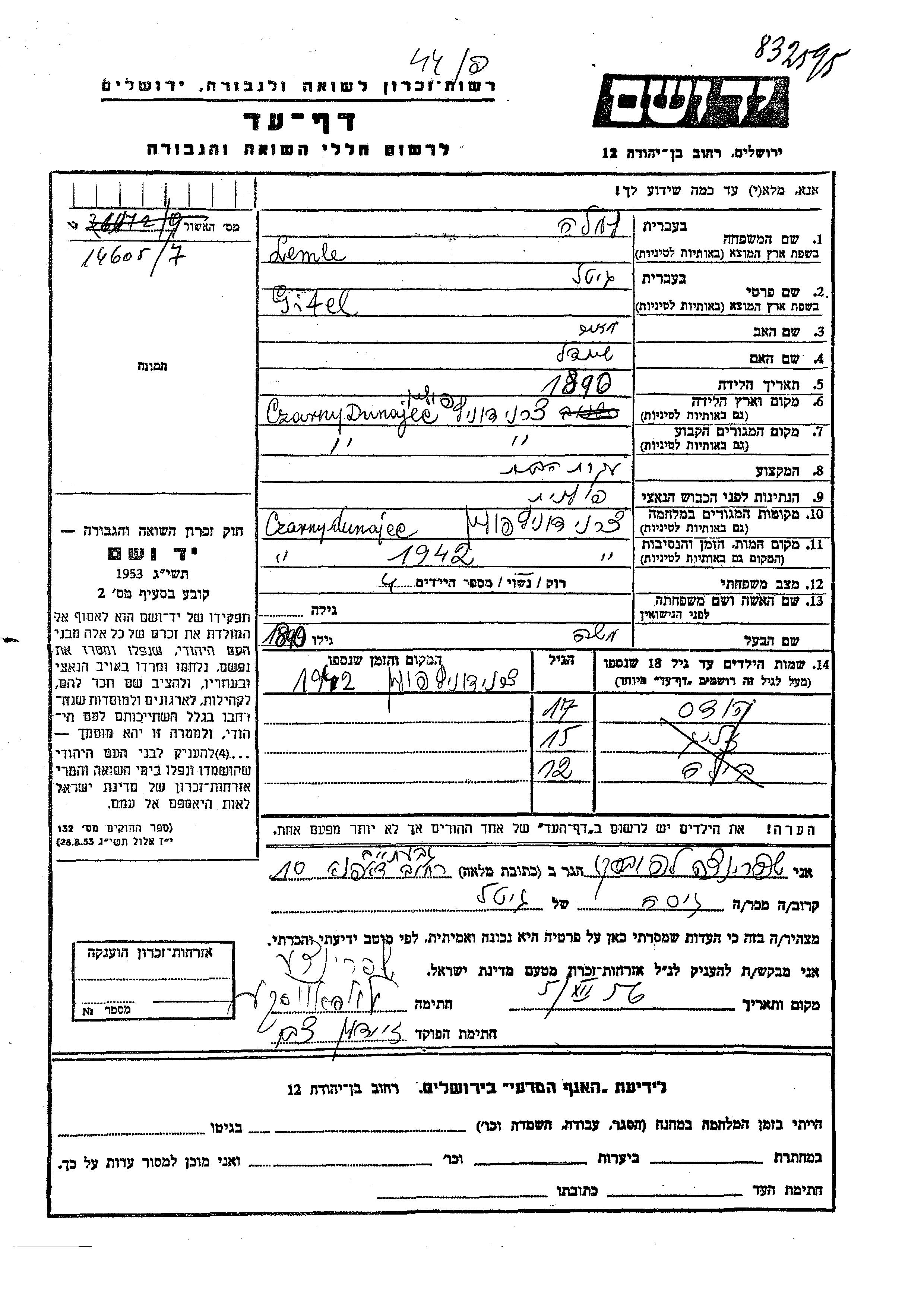 Gitel wurde in der Schoah ermordet. Todesort: Czarny Dunajec, Polen im Jahr 1942.