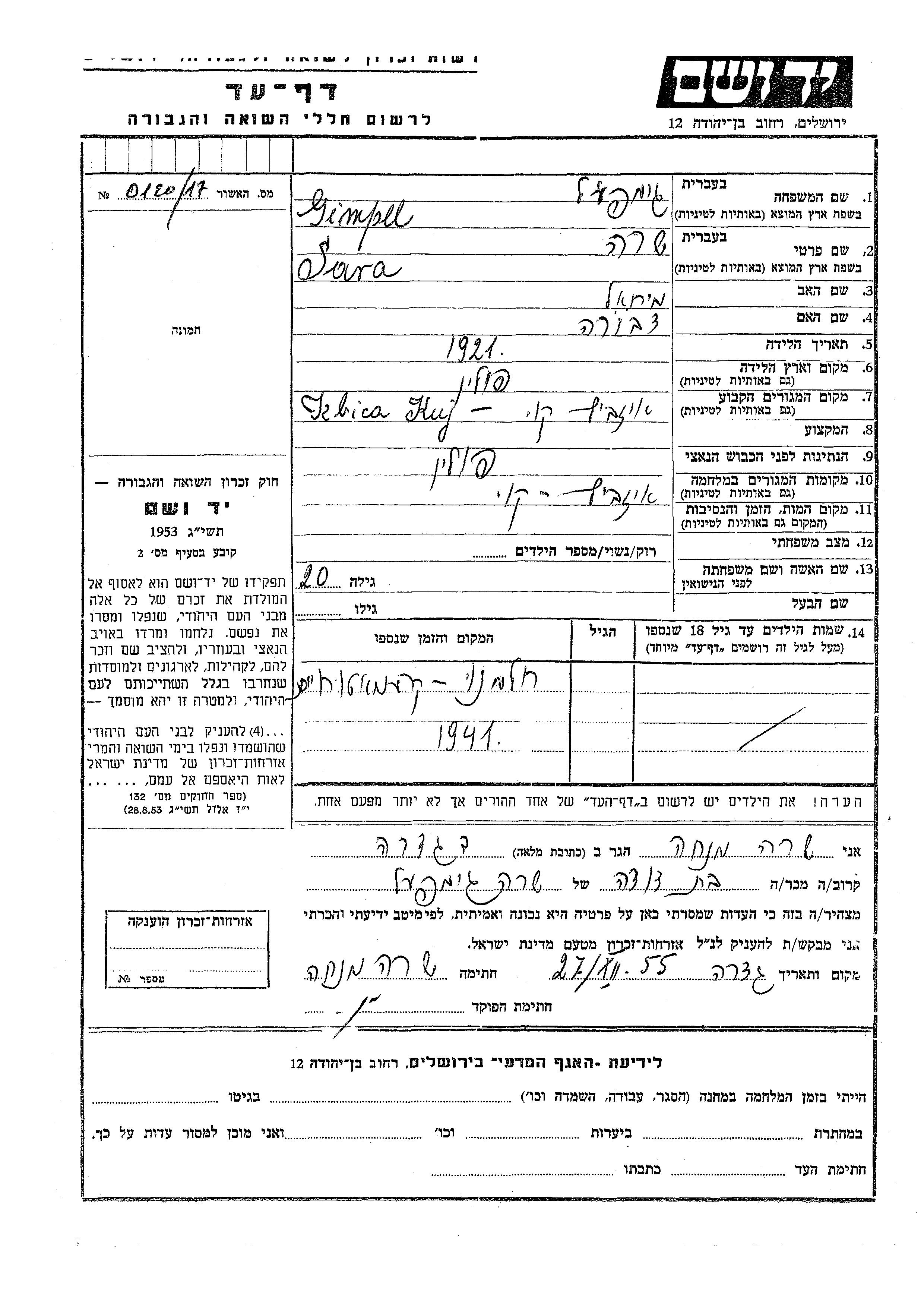 Sara Gimpel wurde im Jahr 1921 in Polen geboren. Sie war die Tochter von Mikhael und Dvora. Vor dem Zweiten Weltkrieg lebte sie in Izbica Kujawska, Polen. Während des Krieges war sie in Izbica Kujawska, Polen.