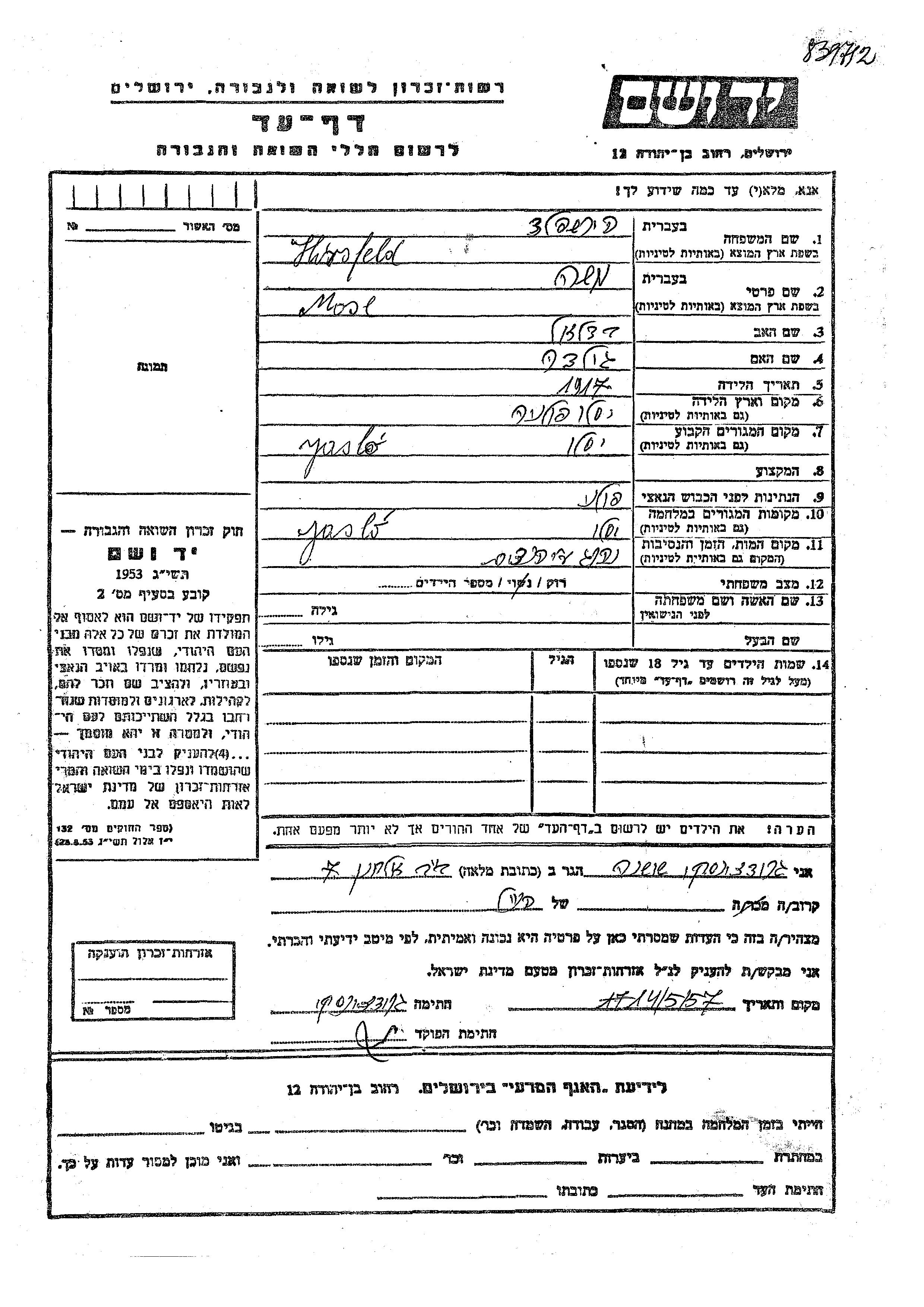 Mose Hirsfeld wurde im Jahr 1917 in Jaslo, Polen geboren. Er war der Sohn von Betzalel und Golda. Er war Ledig. Vor dem Zweiten Weltkrieg lebte er in Jaslo, Polen. Während des Krieges war er in Jaslo, Polen.