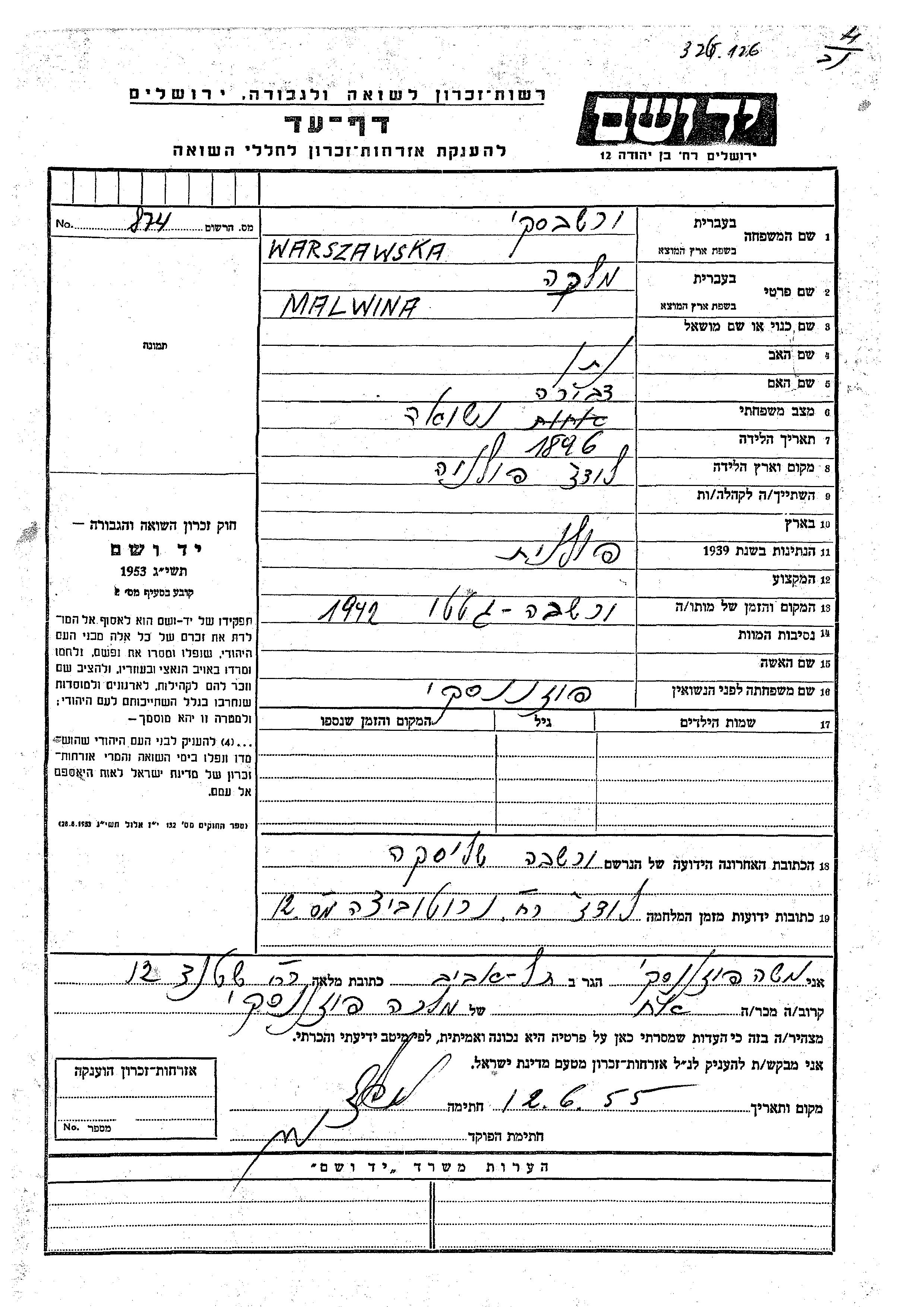 Malwina Malka Warszawska, geb. Poznanski wurde im Jahr 1896 in Lodz, Polen geboren. Sie war die Tochter von Natan und Dvora. Vor dem Zweiten Weltkrieg lebte sie in Lodz, Polen. Während des Krieges war sie in Lodz, Polen.