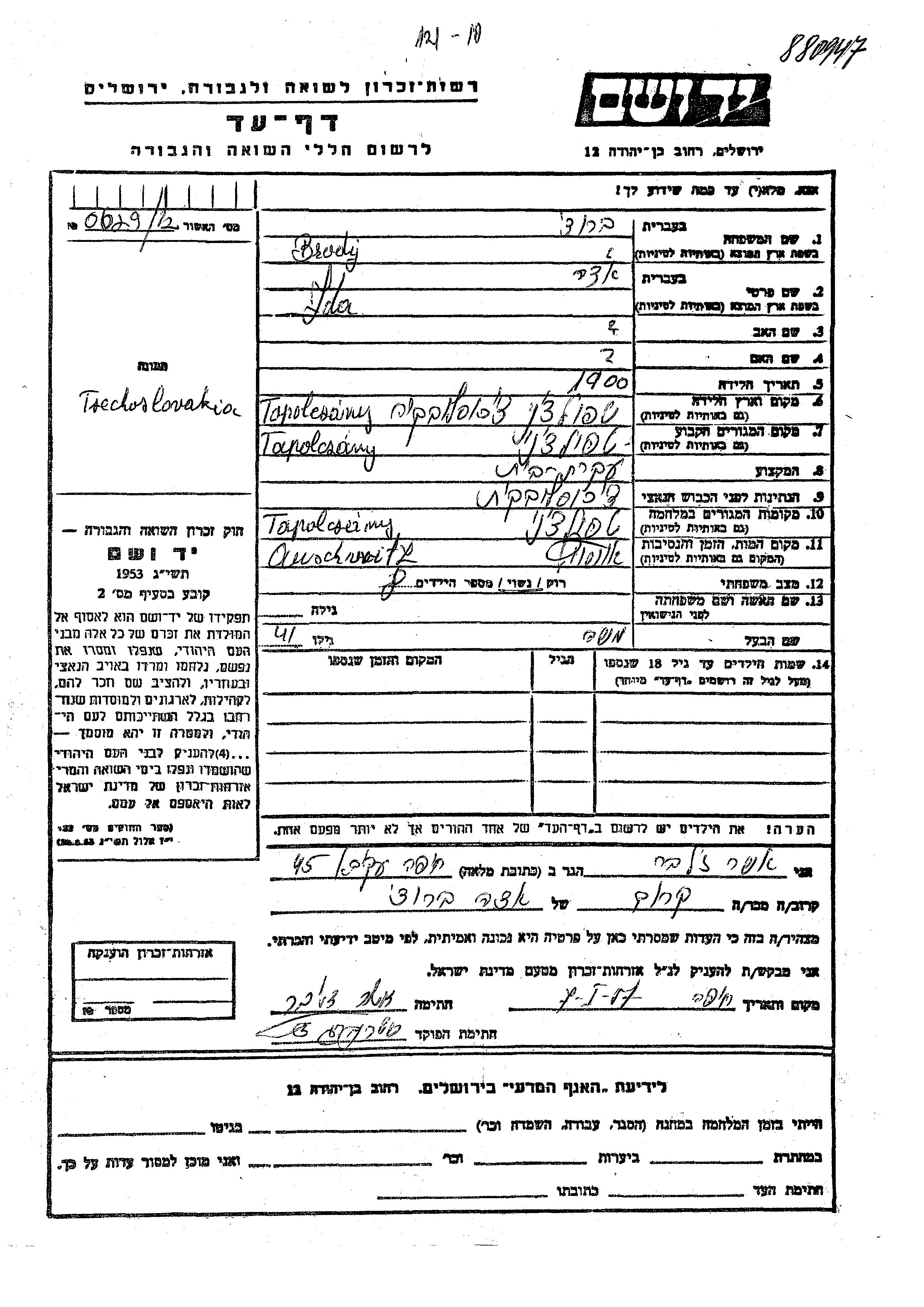 Ida Brody wurde im Jahr 1900 in Topolcany, Tschechoslowakei geboren. Sie war Hausfrau und mit Moshe Verheiratet. Vor dem Zweiten Weltkrieg lebte sie in Topolcany, Tschechoslowakei. Während des Krieges war sie in Topolcany, Tschechoslowakei.