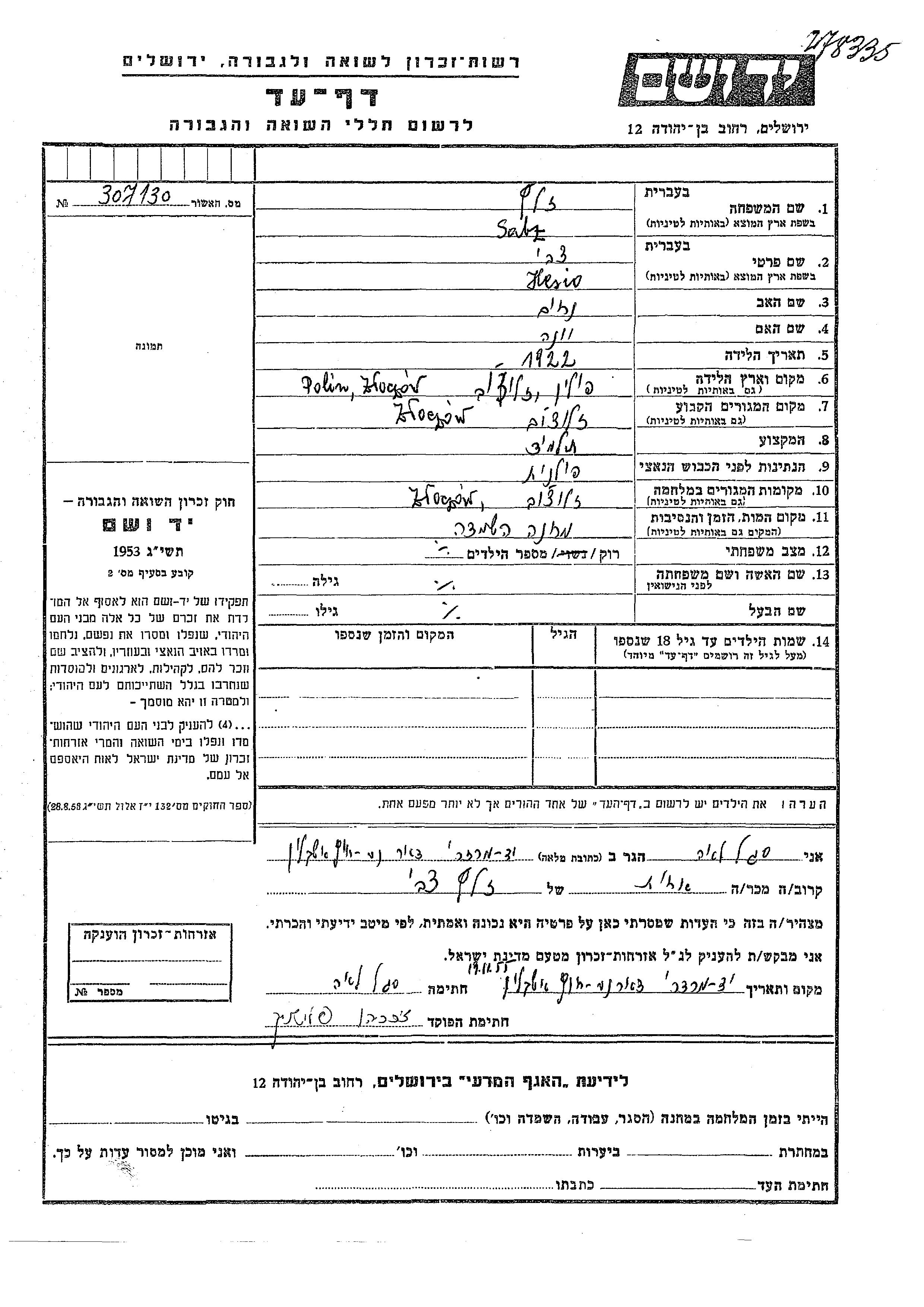 Hesio Tzvi Salz wurde im Jahr 1922 in Zloczow, Polen geboren. Er war der Sohn von Nakhum und Yona. Er war Schüler/-in und Ledig. Vor dem Zweiten Weltkrieg lebte er in Zloczow, Polen. Während des Krieges war er in Zloczow, Polen.