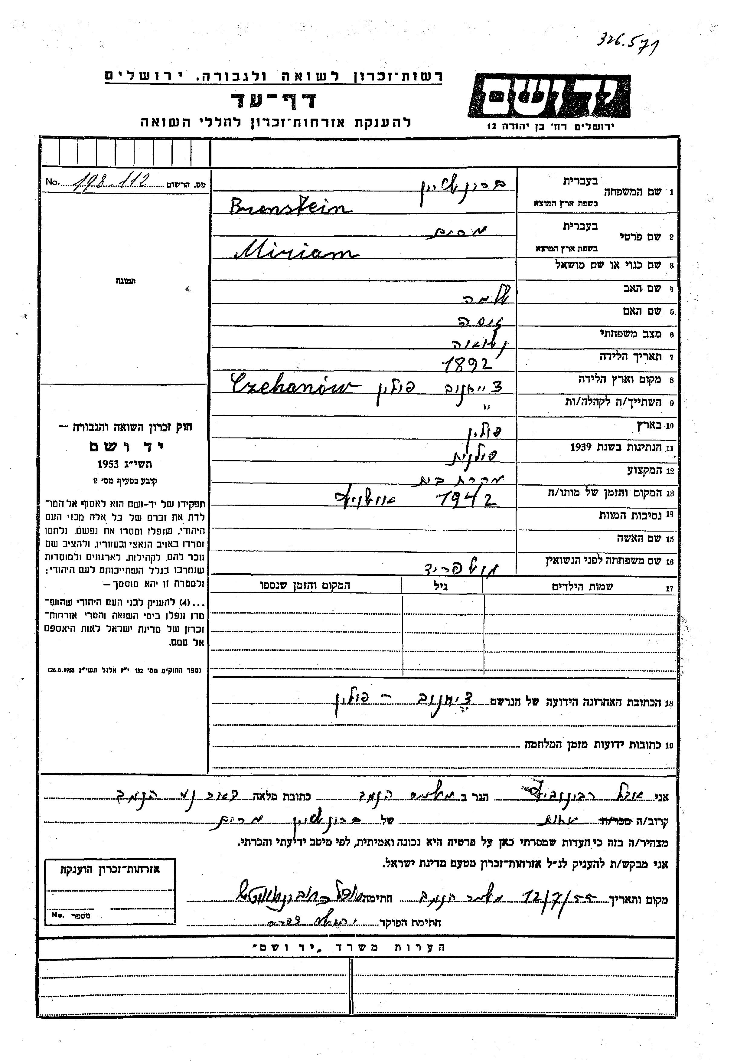 Miriam Bronstein, geb. Gotfrid wurde im Jahr 1892 in Czechanow, Polen geboren. Sie war die Tochter von Shlomo und Gisa. Sie war Hausfrau und Verheiratet.
