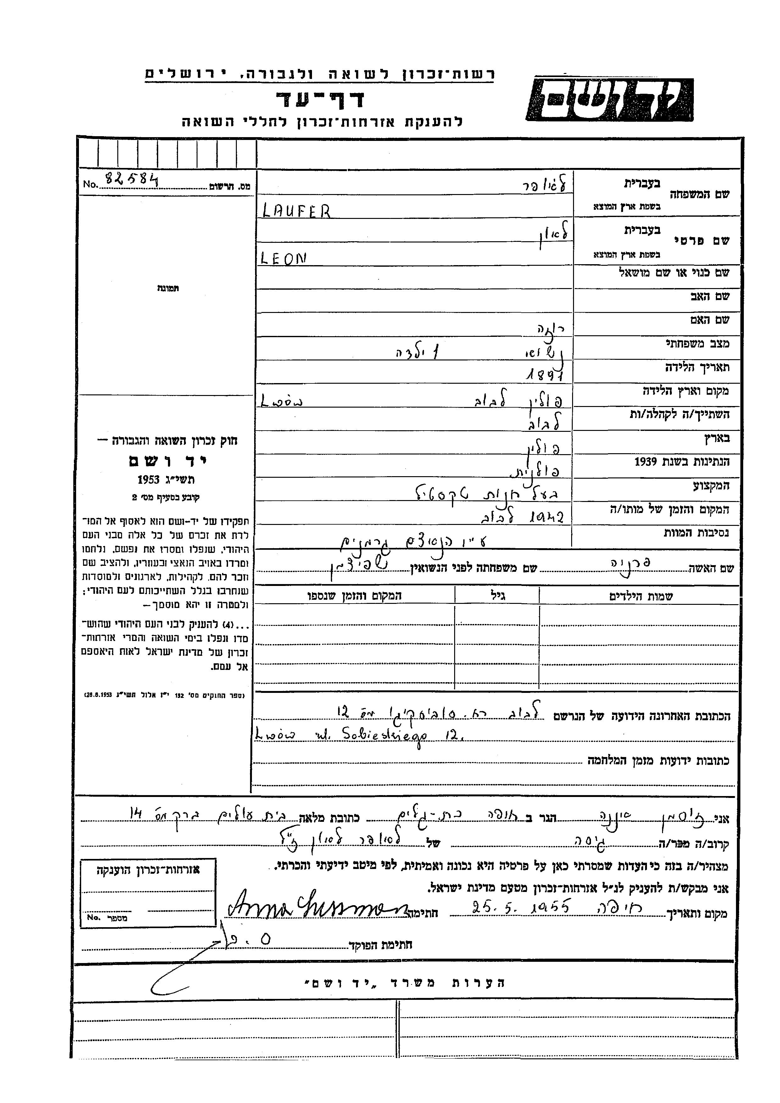 Leon Laufer wurde im Jahr 1891 in Lwow, Polen geboren. Er war der Sohn von Roza. Er war Besitzer/in eines textilgeschäfts und mit Frania, geb. Shpitzman Verheiratet. Während des Krieges war er in Lwow, Polen.