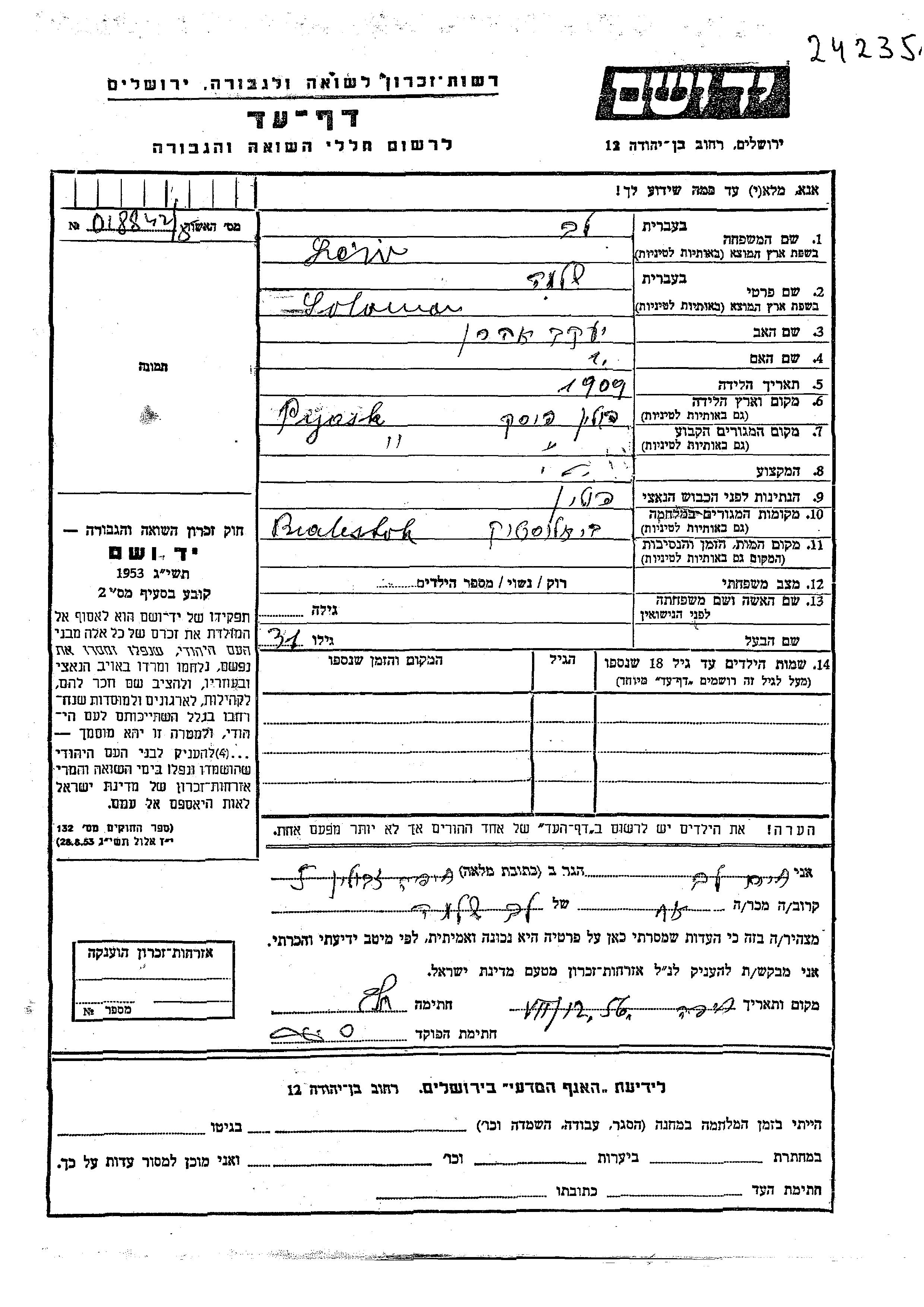 Salomon Lew wurde im Jahr 1909 in Pisek, Tschechoslowakei geboren. Er war der Sohn von Yaakov Aharon. Vor dem Zweiten Weltkrieg lebte er in Pisek, Tschechoslowakei. Während des Krieges war er in Bialistok, Polen.