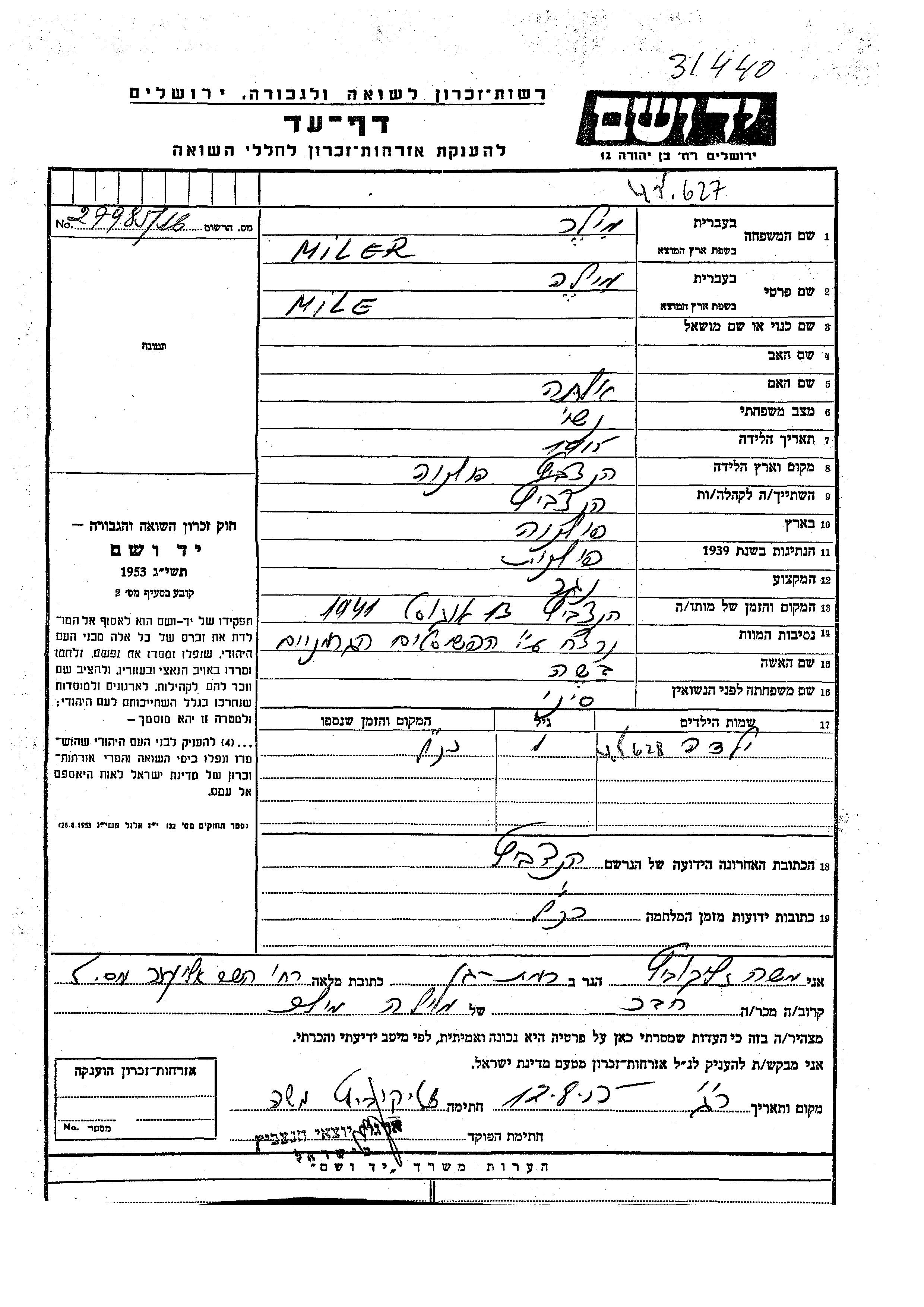 Mile Mila Miler, geb. Sinai wurde im Jahr 1915 in Hancewicze, Polen geboren. Sie war die Tochter von Alte. Sie war Zimmermann und mit Basha Verheiratet. Vor dem Zweiten Weltkrieg lebte sie in Hancewicze, Polen. Während des Krieges war sie in Hancewicze, Polen.