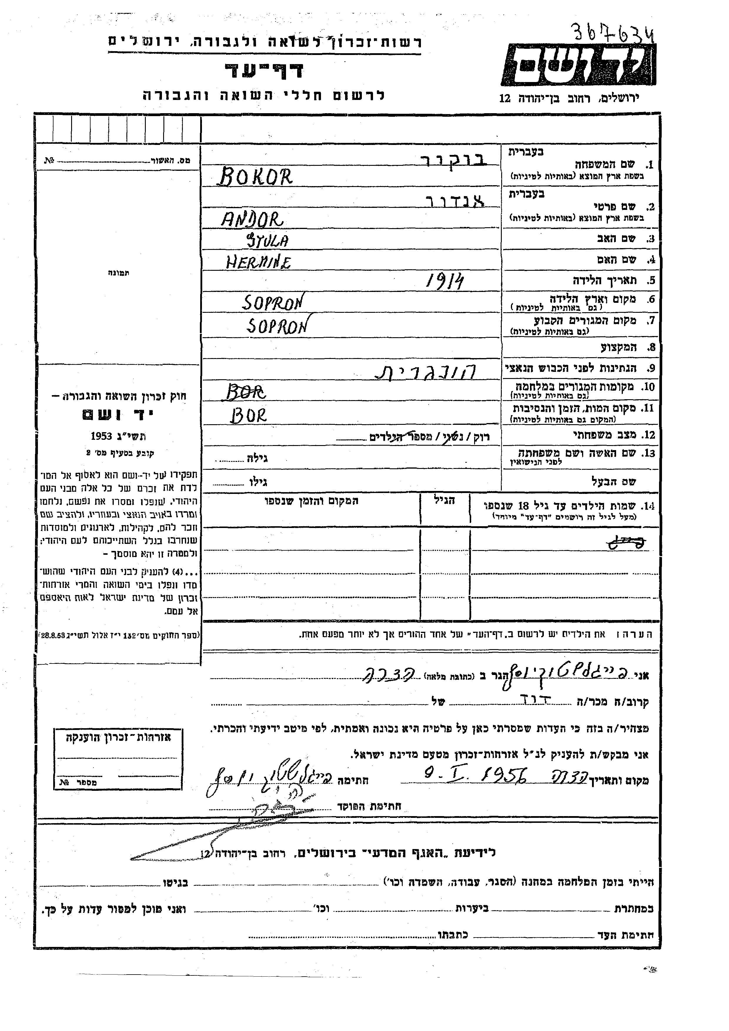 Andor Bokor wurde im Jahr 1914 in Sopron, Ungarn geboren. Er war der Sohn von Srula und Hermine. Er war Ledig. Vor dem Zweiten Weltkrieg lebte er in Sopron, Ungarn.