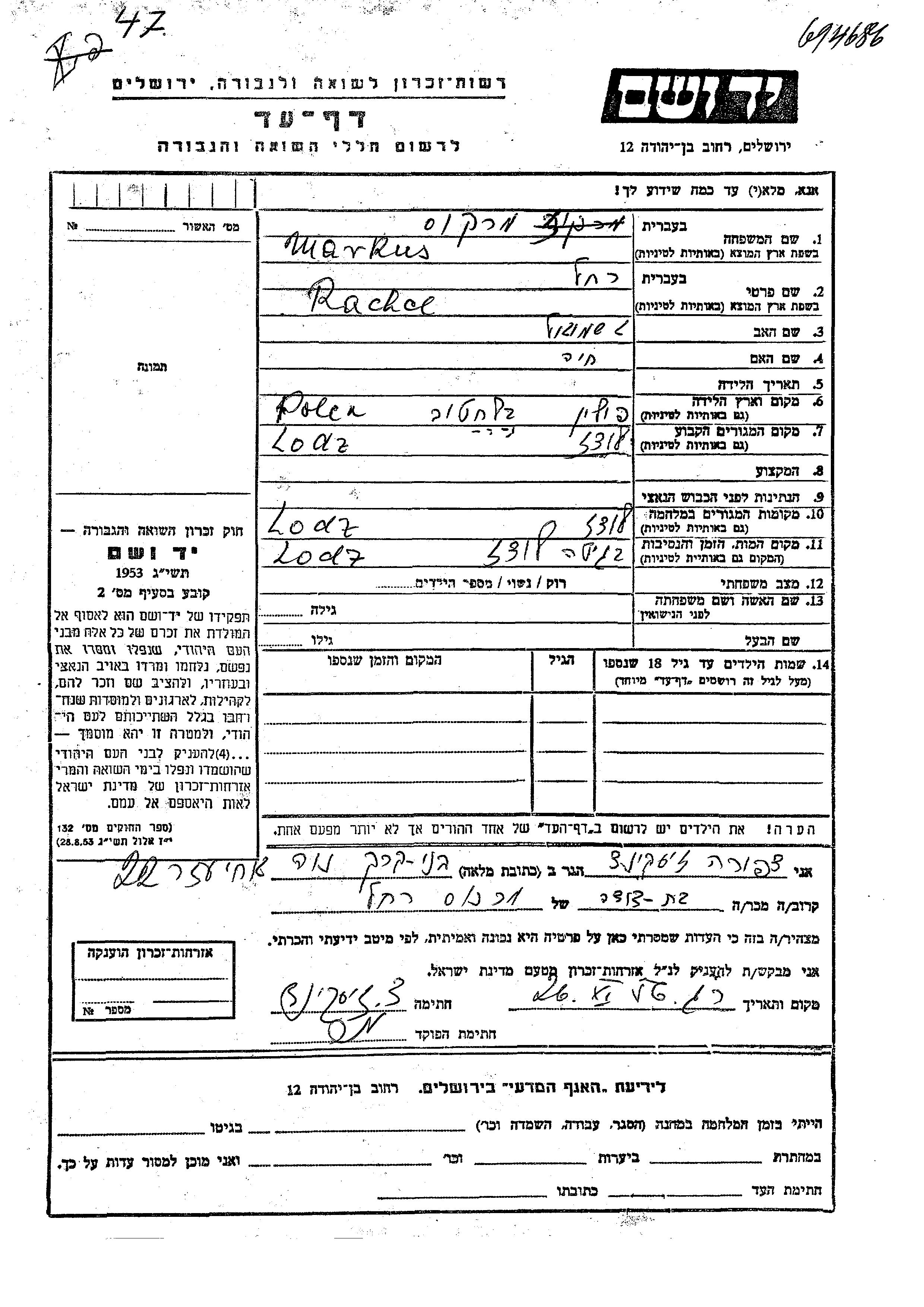 Rachel Markus wurde in Bełchatów, Polen geboren. Sie war die Tochter von Shmuel und Khaia. Vor dem Zweiten Weltkrieg lebte sie in Lodz, Polen. Während des Krieges war sie in Lodz, Polen.