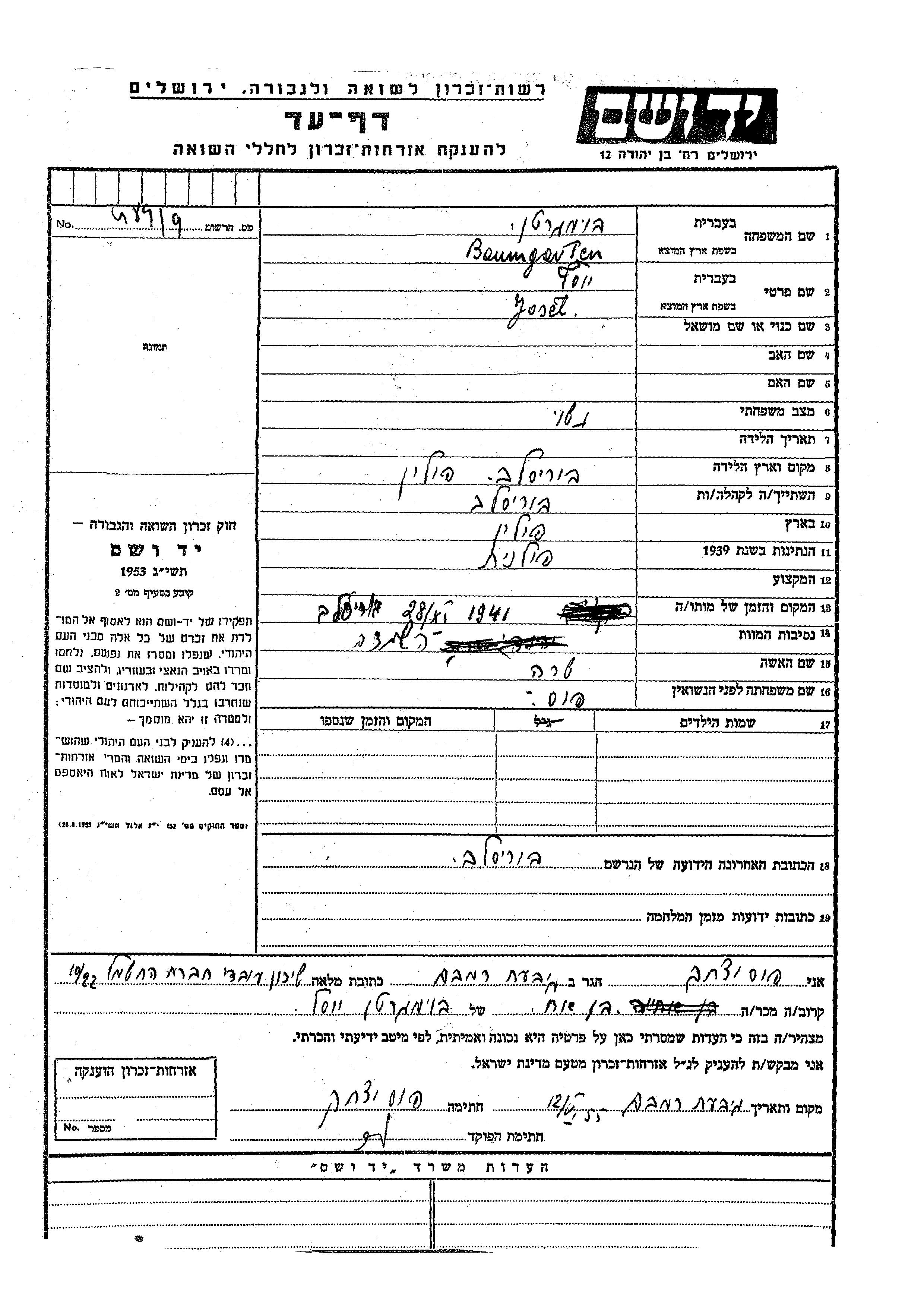 Yosef wurde in der Schoah ermordet. Todesort: Borislav, Polen im Jahr 28/11/1941.