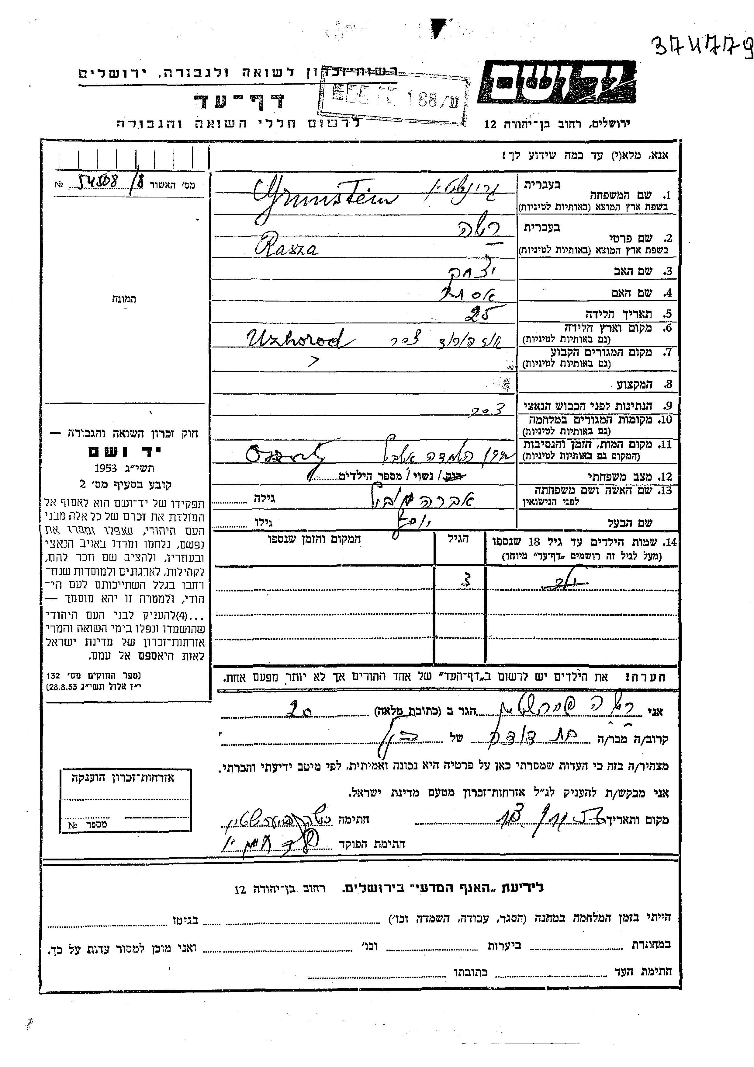 Rasha Grinstein, geb. Abrahamovitz wurde in Uzhorod, Tschechoslowakei geboren. Sie war die Tochter von Yitzkhak und Ester. Sie war mit Yosef Verheiratet. Vor dem Zweiten Weltkrieg lebte sie in Uzhorod, Tschechoslowakei.