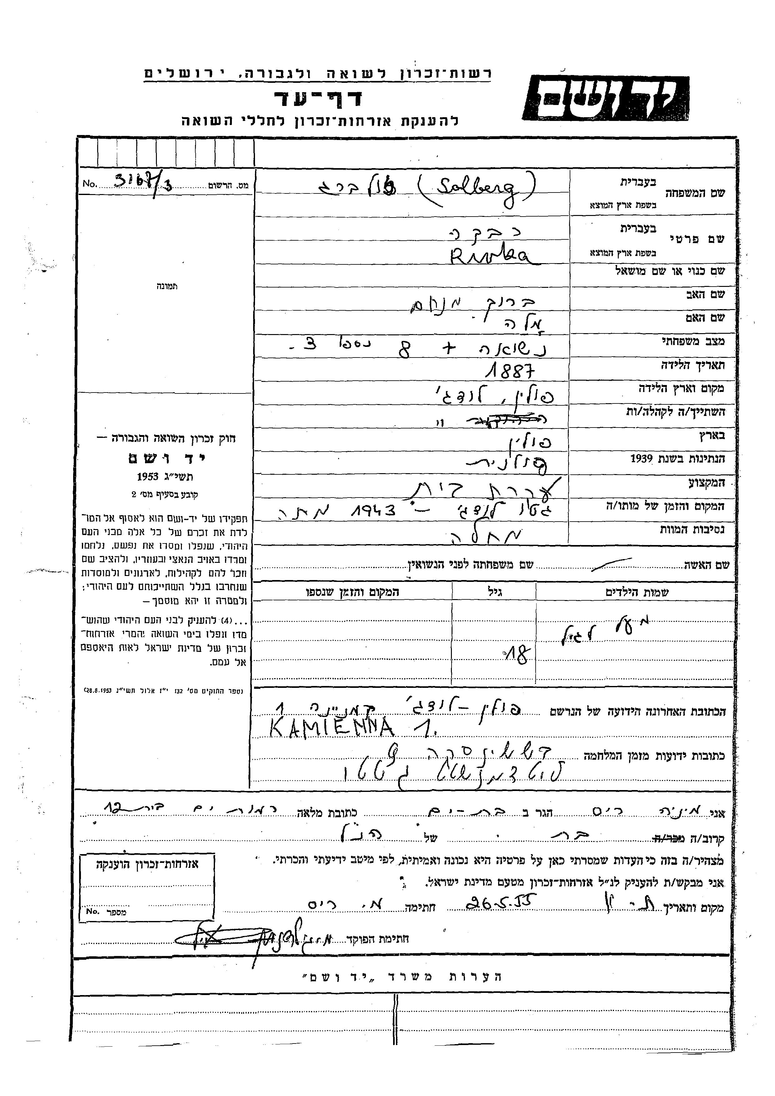 Rivka Solberg wurde im Jahr 1887 in Lodz, Polen geboren. Sie war die Tochter von Barukh Menakhem und Mala. Sie war Hausfrau und Verheiratet. Vor dem Zweiten Weltkrieg lebte sie in Lodz, Polen. Während des Krieges war sie in Lodz, Polen.