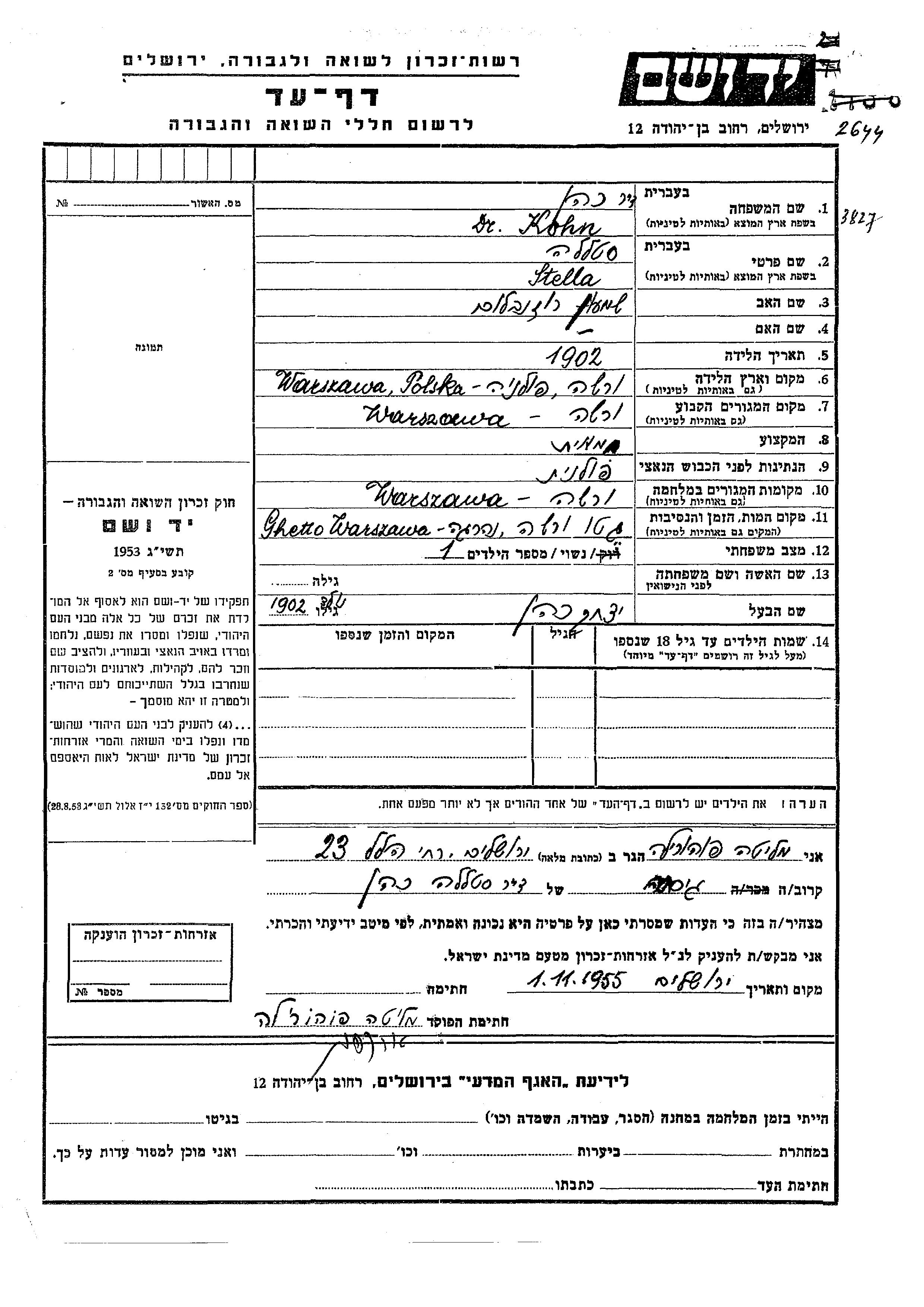 Dr. Stella Kohn, geb. Rozenblum wurde im Jahr 1902 in Warszawa, Polen geboren. Sie war die Tochter von Shimon. Sie war Chemikerin und mit Yitzkhak Verheiratet. Vor dem Zweiten Weltkrieg lebte sie in Warszawa, Polen. Während des Krieges war sie in Warszawa, Polen.