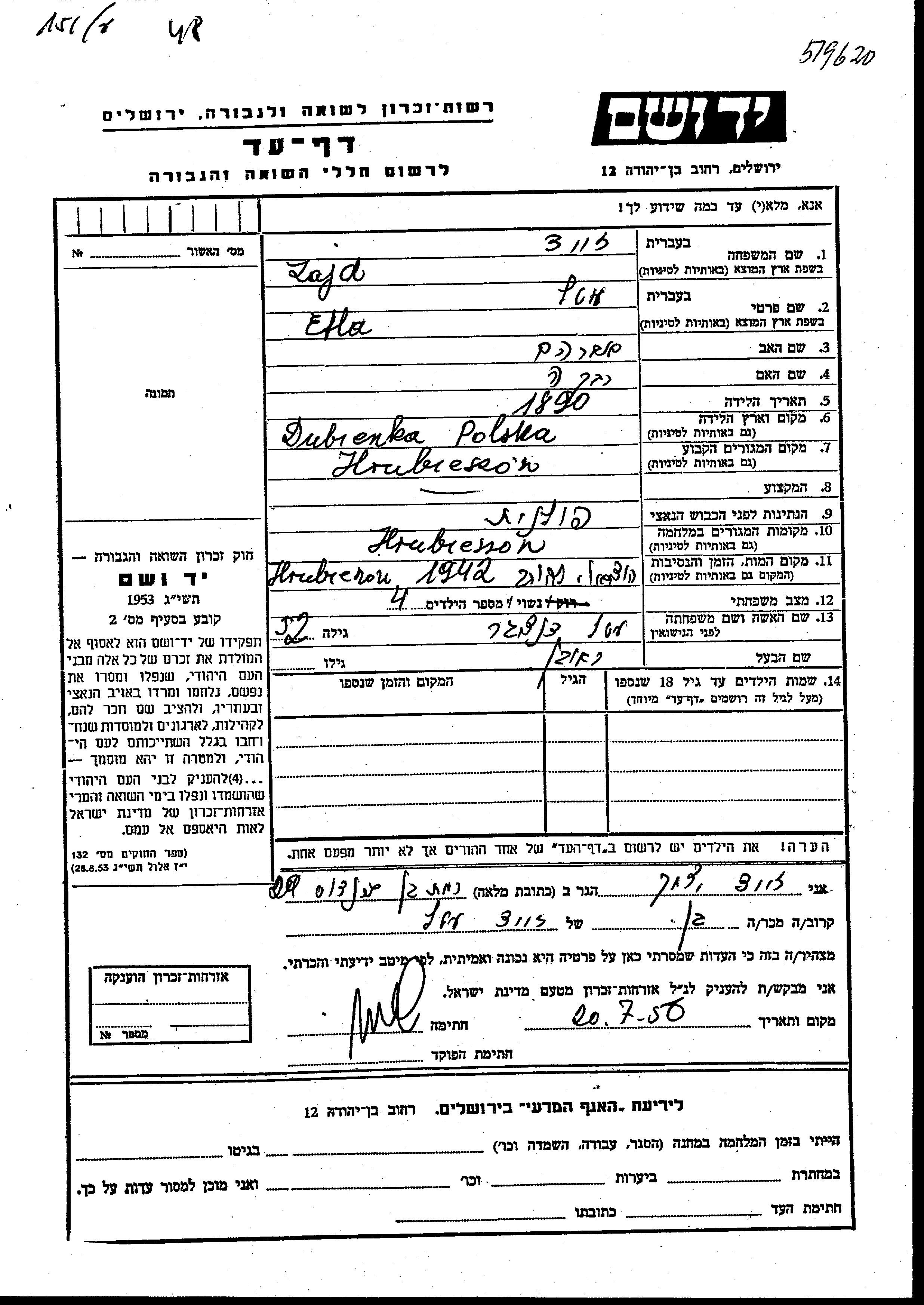 Etla Zajd, geb. Danziger wurde im Jahr 1890 in Dubienka, Polen geboren. Sie war die Tochter von Avraham und Rivka. Sie war mit Reuven Verheiratet. Vor dem Zweiten Weltkrieg lebte sie in Hrubieszow, Polen. Während des Krieges war sie in Hrubieszow, Polen.