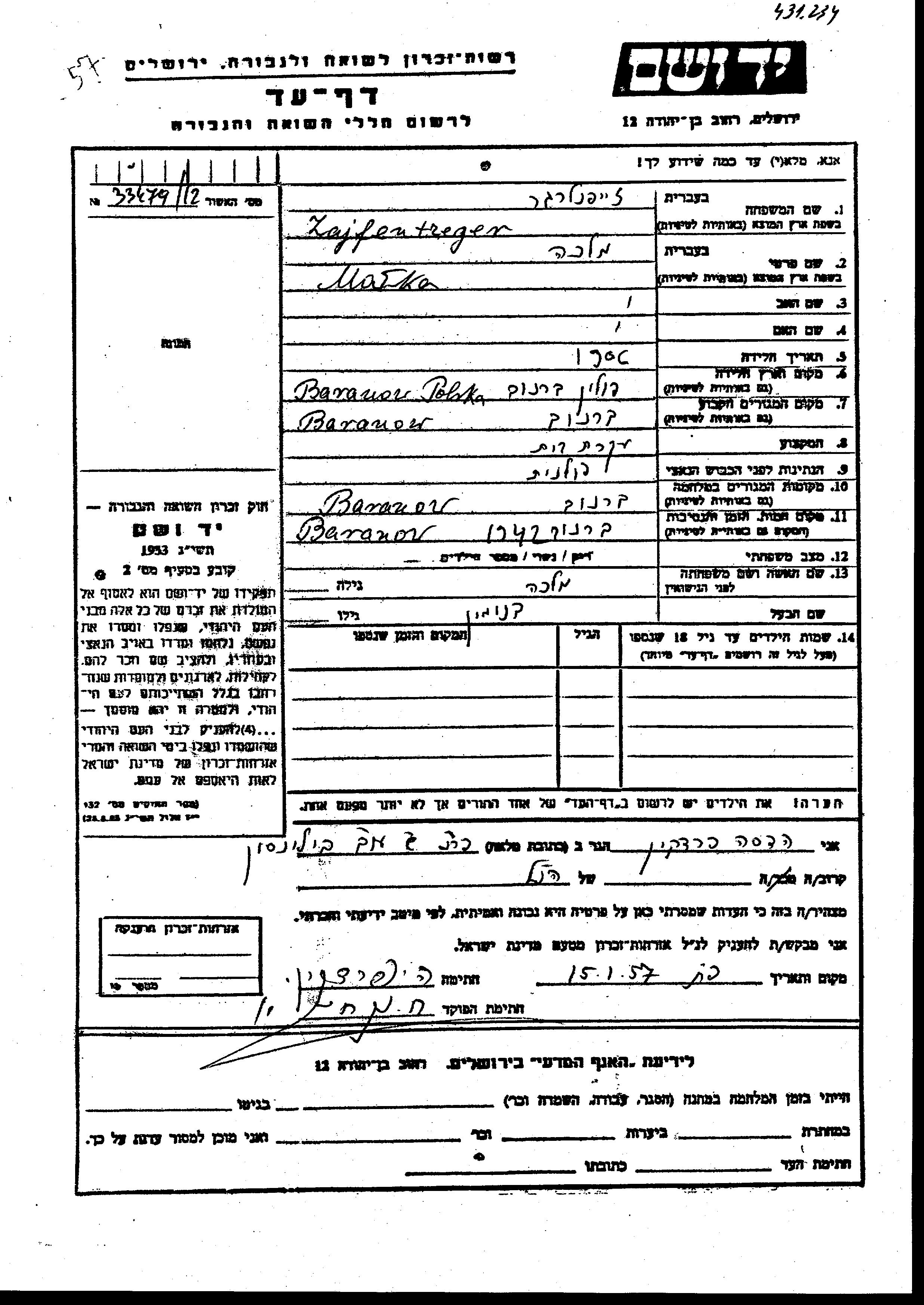 Malka Zajfentreger wurde im Jahr 1906 in Baranów, Polen geboren. Sie war Hausfrau und mit Beniamin Verheiratet. Vor dem Zweiten Weltkrieg lebte sie in Baranów, Polen. Während des Krieges war sie in Baranów, Polen.
