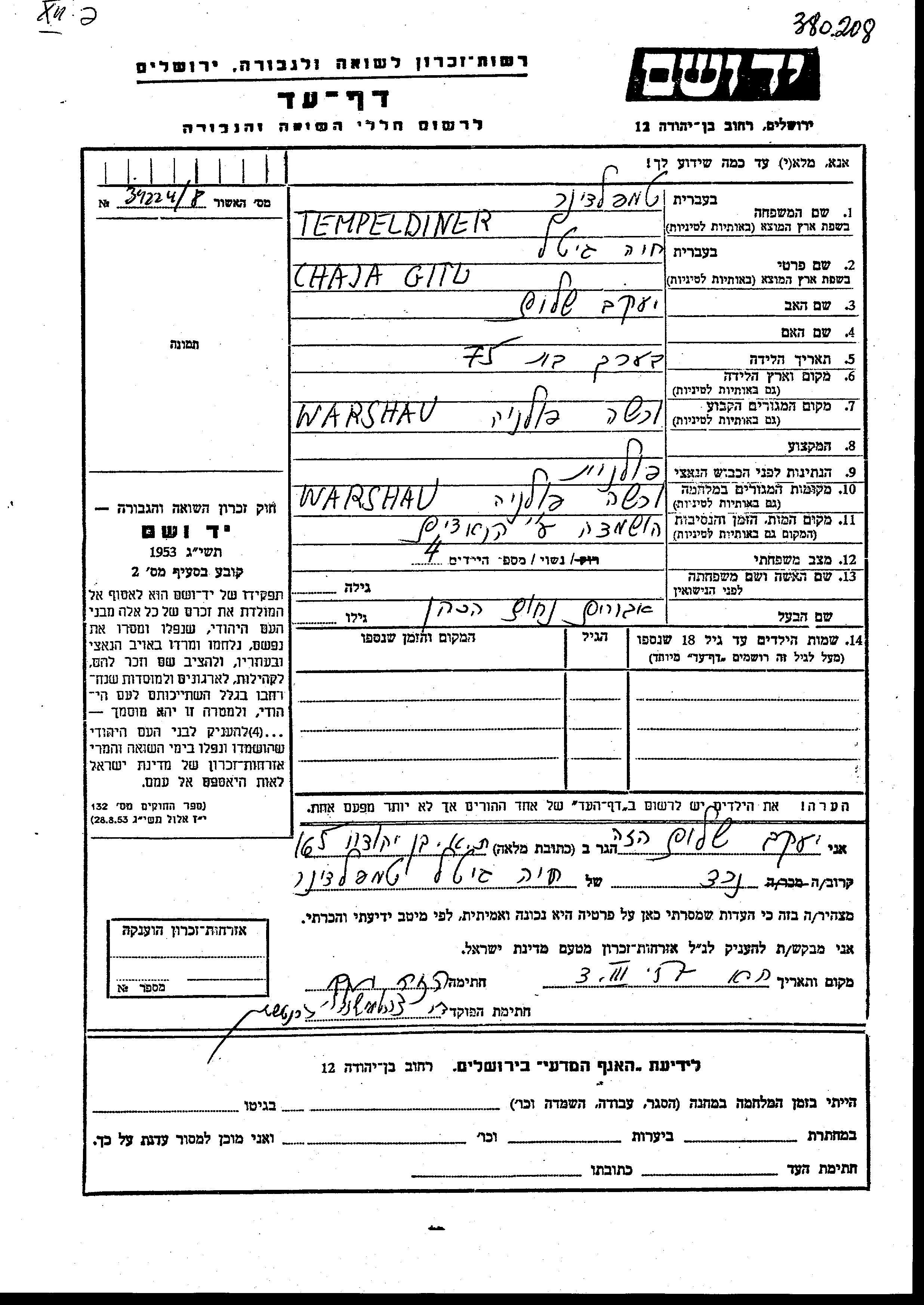 Chaja Gitl Tempeldiner wurde Sie war die Tochter von Yaakov Shalom. Sie war mit Avraham Nakhum Verheiratet. Vor dem Zweiten Weltkrieg lebte sie in Varsha, Polen. Während des Krieges war sie in Varsha, Polen.