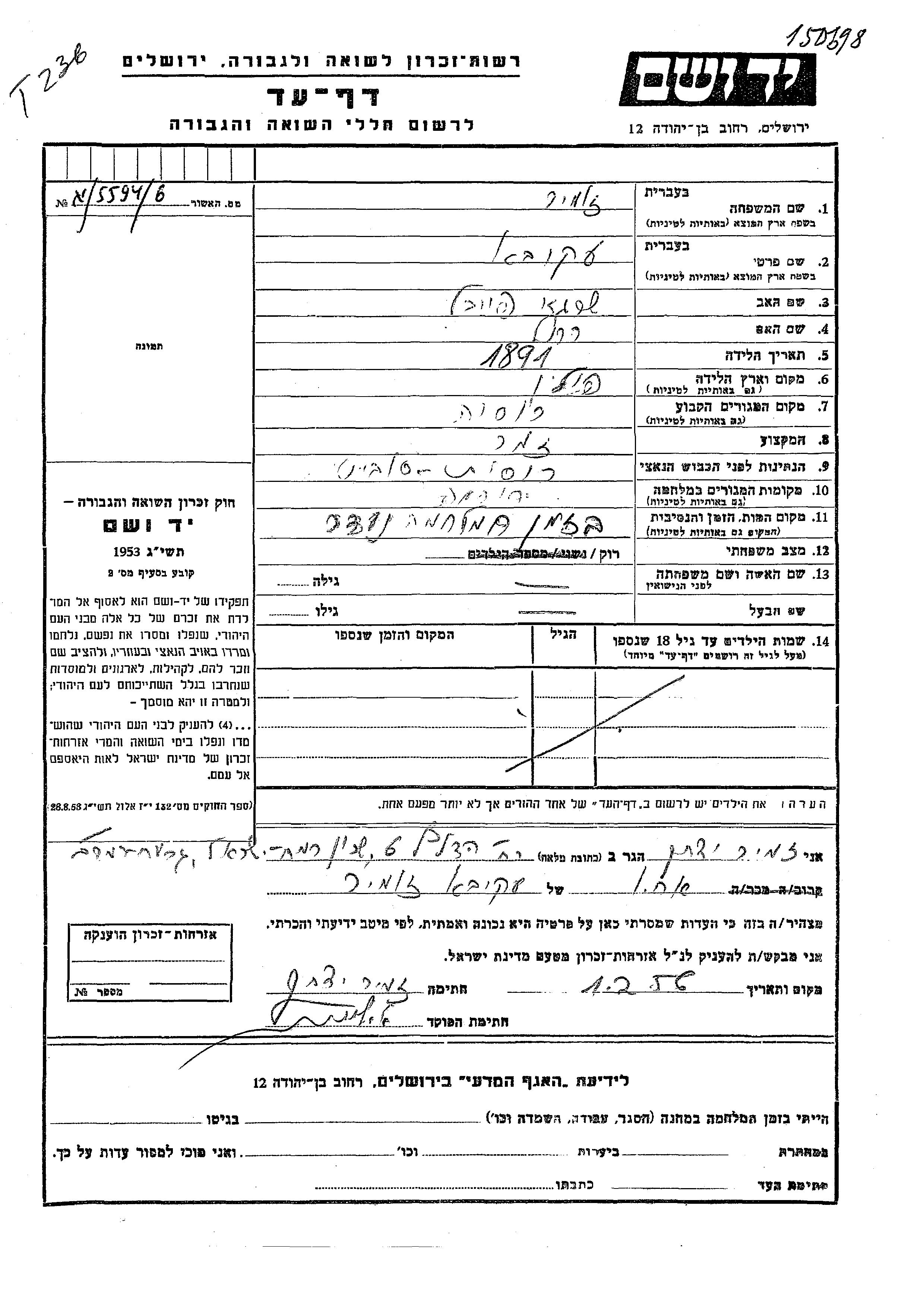 Akiva Zumir wurde im Jahr 1891 in Polen geboren. Er war der Sohn von Shraga Faivel und Rakhel. Er war Sänger/-in und Ledig. Vor dem Zweiten Weltkrieg lebte er in Rosia Cosa, Rumänien. Während des Krieges war er in Russland (UdSSR).