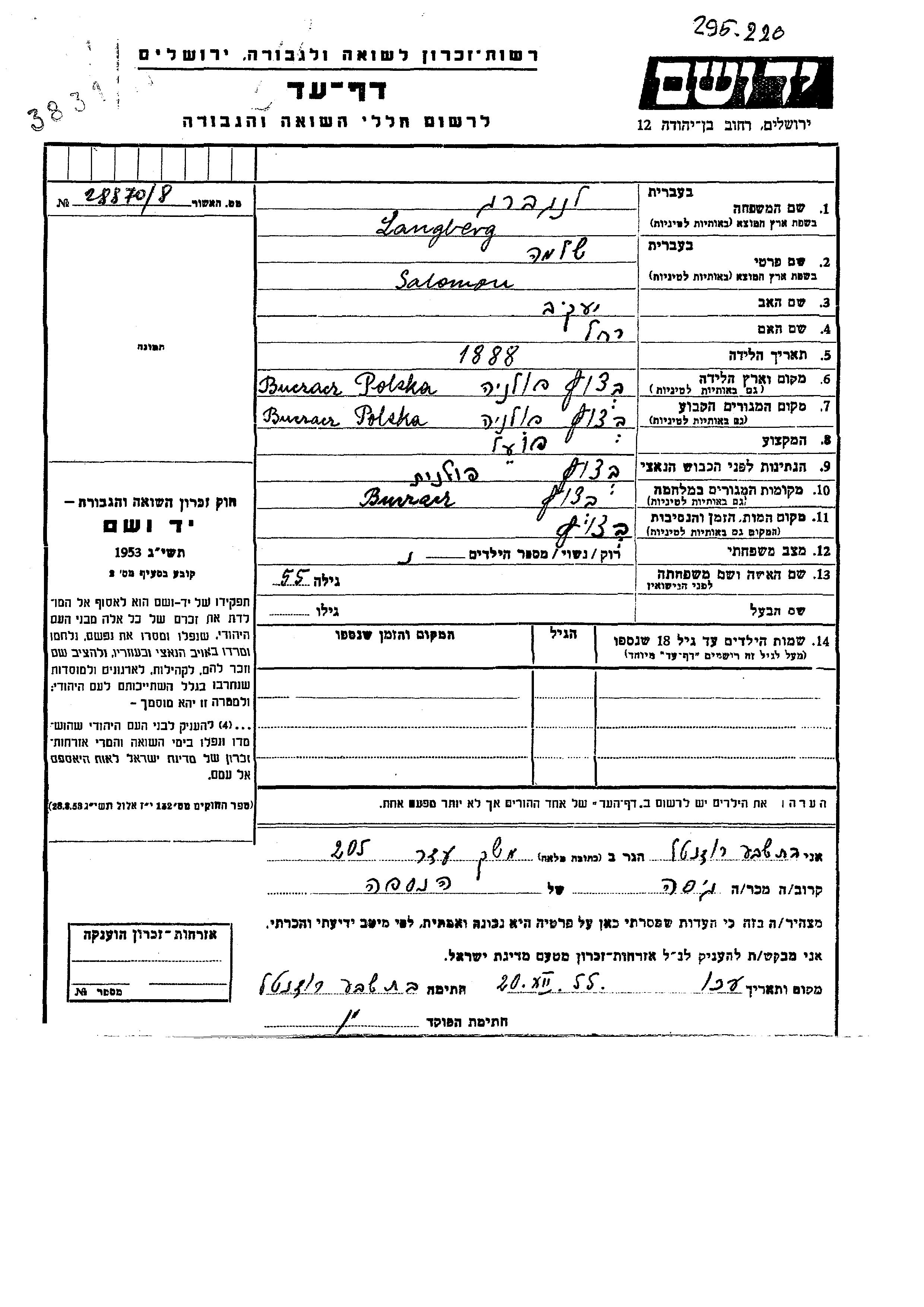 Salomon Langberg wurde im Jahr 1888 in Buczacz, Polen geboren. Er war der Sohn von Yaakov und Rakhel. Er war Arbeiter/-in und Verheiratet. Vor dem Zweiten Weltkrieg lebte er in Buczacz, Polen. Während des Krieges war er in Buczacz, Polen.