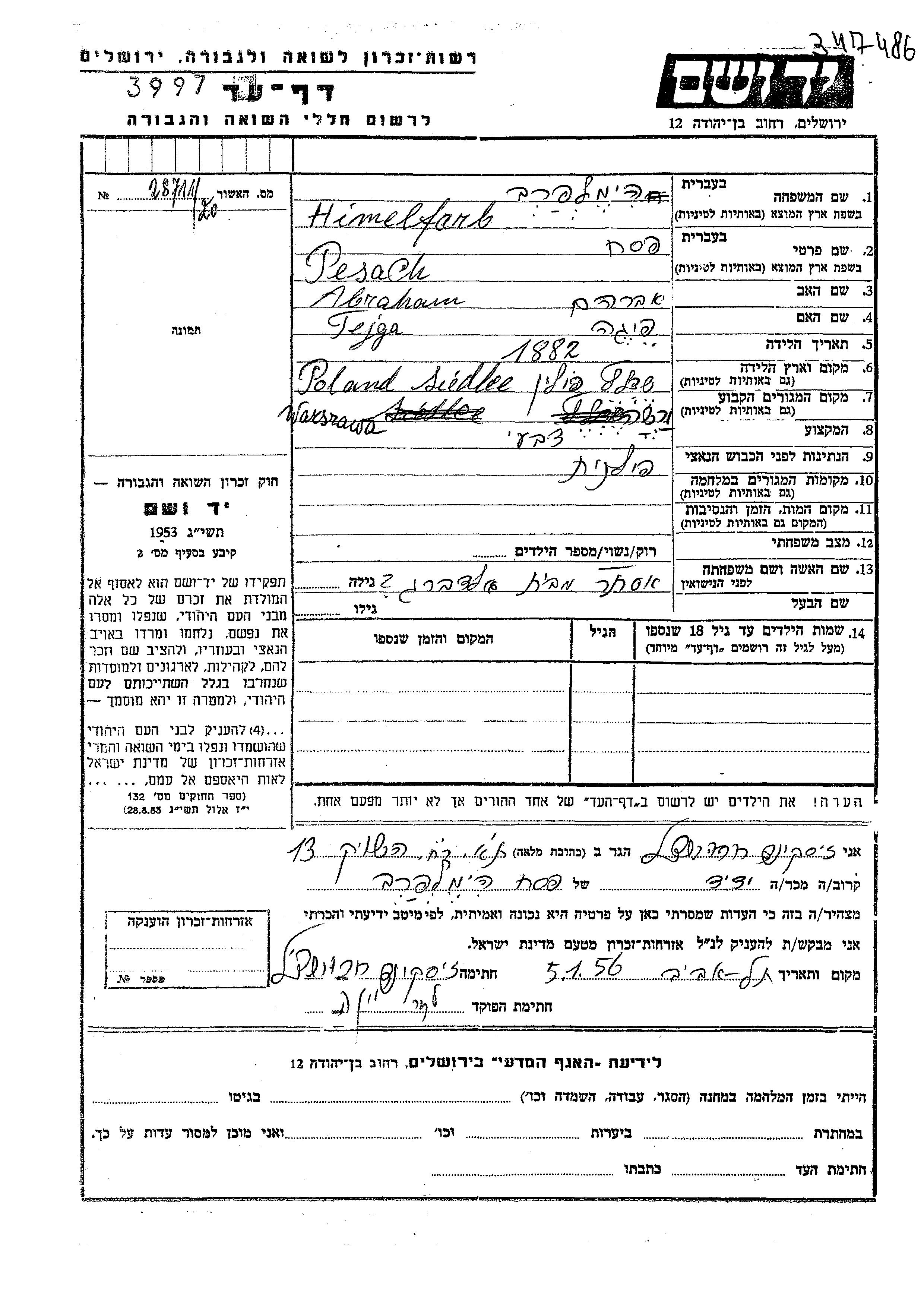 Pesach Himelfarb wurde im Jahr 1882 in Siedlce, Polen geboren. Er war der Sohn von Abraham und Fejga. Er war Anstreicher/-in und mit Ester, geb. Goldberg Verheiratet. Vor dem Zweiten Weltkrieg lebte er in Warszawa, Polen.